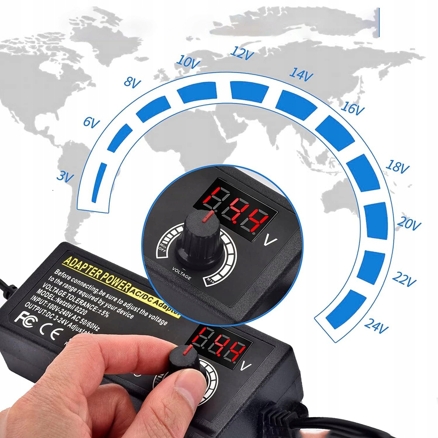 Вхід: 100 ~ 240 В змінного струму, 50/60 Гц, вихідна напруга 3 В ~ 24 В постійного струму, регульована. Максимальна потужність 3А, 72Вт; може видавати струми нижче 3 А, напр. 300 мА, 500 мА, 1 А, 1,5 А, 2 А, 2,5 А, 3 А. Виміряна вихідна напруга від 2,85 В до 25,2 В знаходиться в межах стандартного діапазону та є дійсною з допуском галузевого стандарту ±5%. Перш ніж підключати виріб, переконайтеся, що він сумісний із діапазоном напруги вашого пристрою.