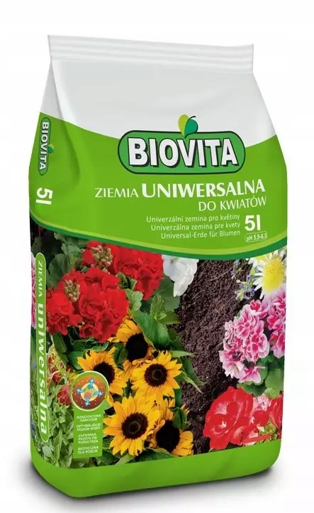 Грунт універсальний БІОВІТА - незамінний субстрат для посадки та пересадки декоративних рослин у будинках, садах, на балконах і терасах, крім кислотолюбивих рослин. Містить багатокомпонентне добриво, тому не потребує підгодівлі протягом 4-6 тижнів. Високий торф, що міститься в субстраті, збільшує повітроємність, покращує структуру, створює сприятливі умови для розвитку кореневої системи. Правильно складена суміш інгредієнтів забезпечує дуже хорошу водоємність, але не можна допускати повного висихання субстрату. Ретельно підібраний хімічний і фізичний склад землі створює сприятливі умови для розвитку рослин і вегетації.
