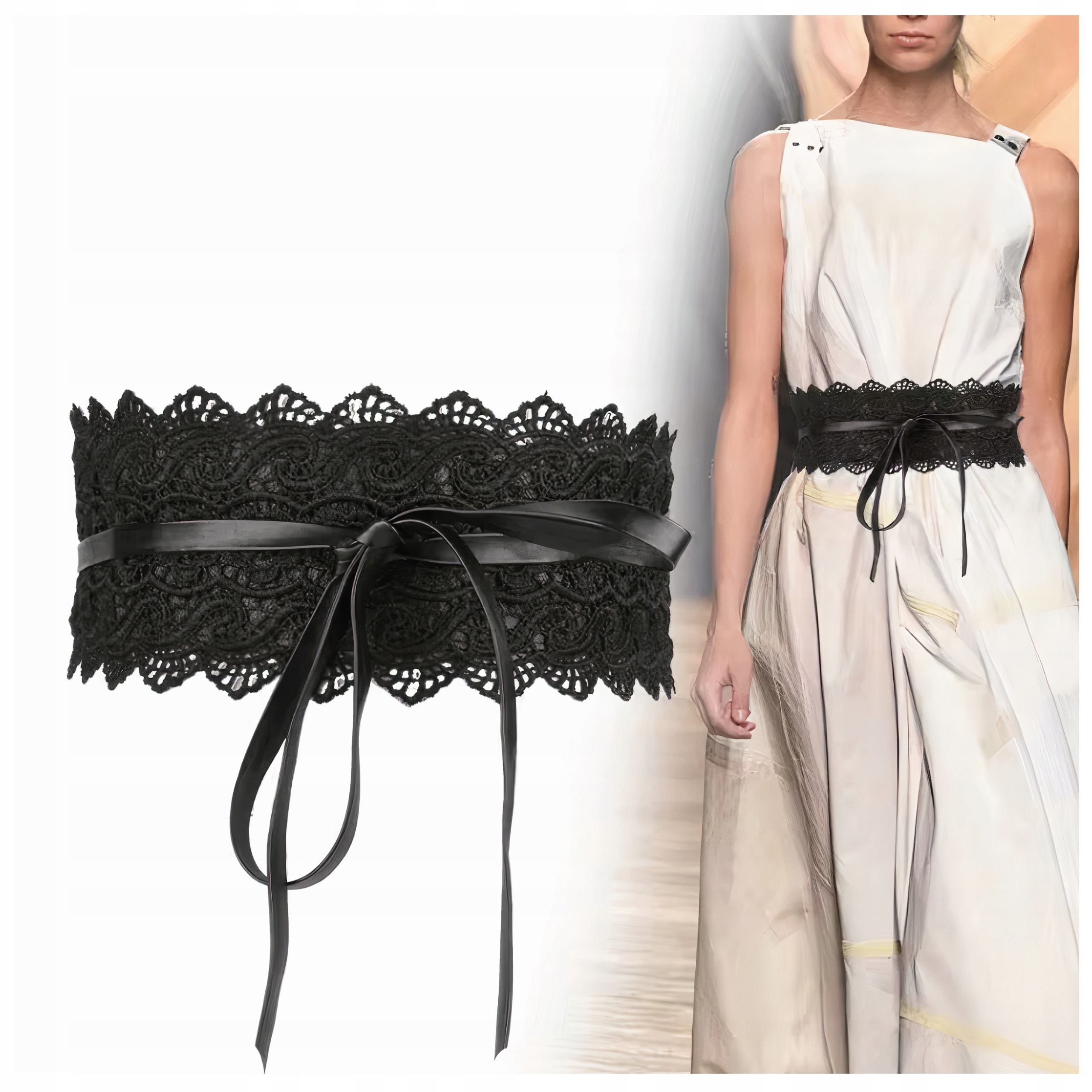 Підкресліть свою жіночність і унікальний стиль за допомогою цього елегантного поясного пояса! Виготовлена з широкого 10-сантиметрового мережива і ремінців з екошкіри. Використовуючи цей ремінь, ви можете створити безліч унікальних стилів. Ідеально підходить для светрів, суконь і тунік.