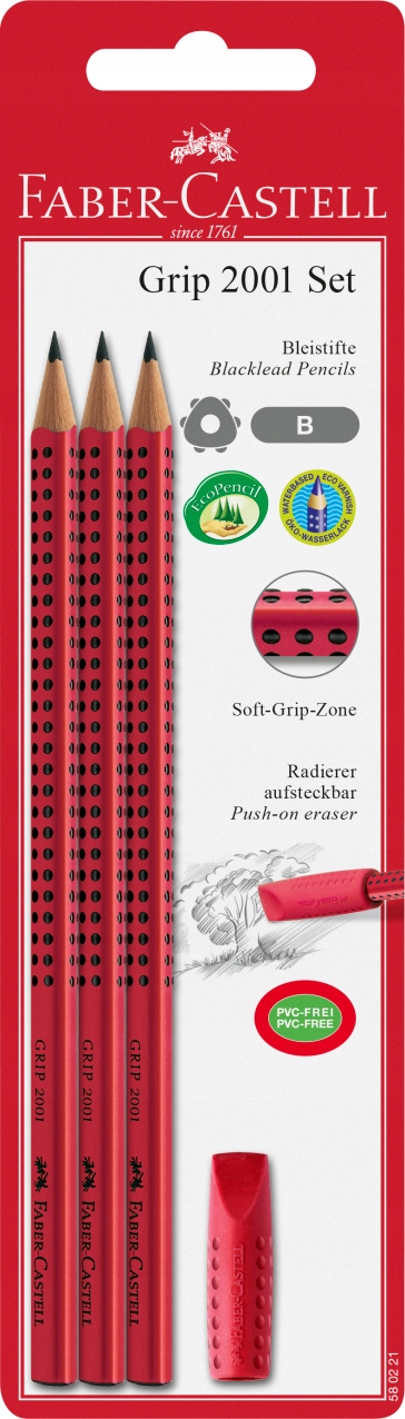 Набір графітних олівців Grip 2001 Faber-Castell, 3 шт. червоного кольору з гумовим ковпачком.