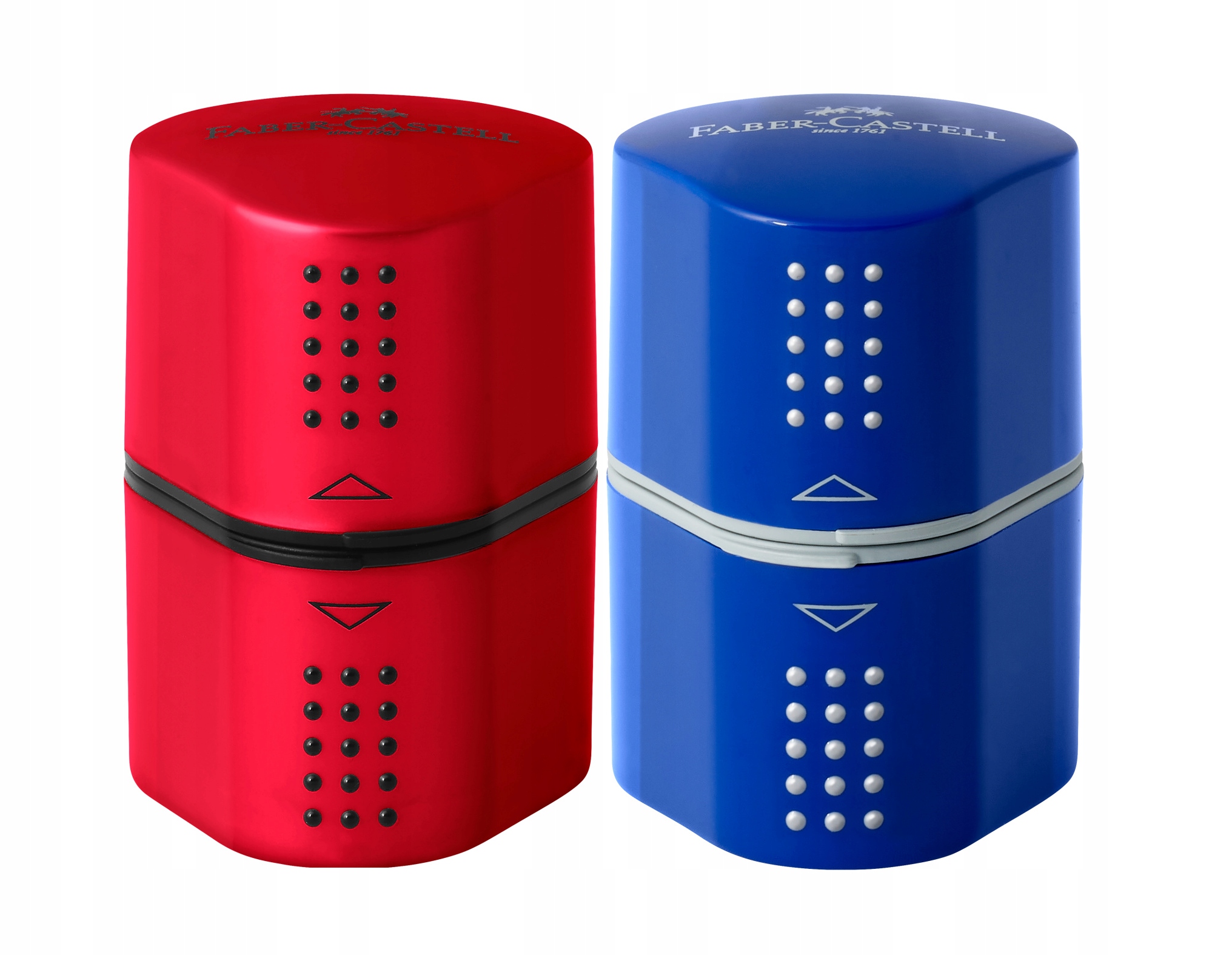Сточилка 3-в-1 Trio Faber-Castell червоного або синього кольору з контейнером для точилки.