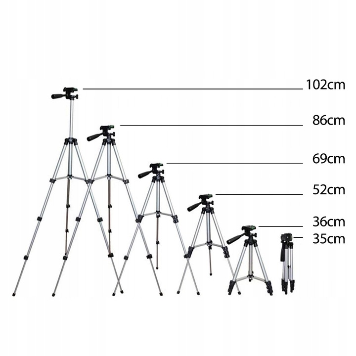 Високоякісний штатив із регульованою висотою, ідеально підходить для користувачів смартфонів, спортивних камер, невеликих відеокамер і цифрових камер. Його конструкція дозволяє стабільно розміщувати його на нерівних поверхнях, що гарантує високу якість фотографій і відео.