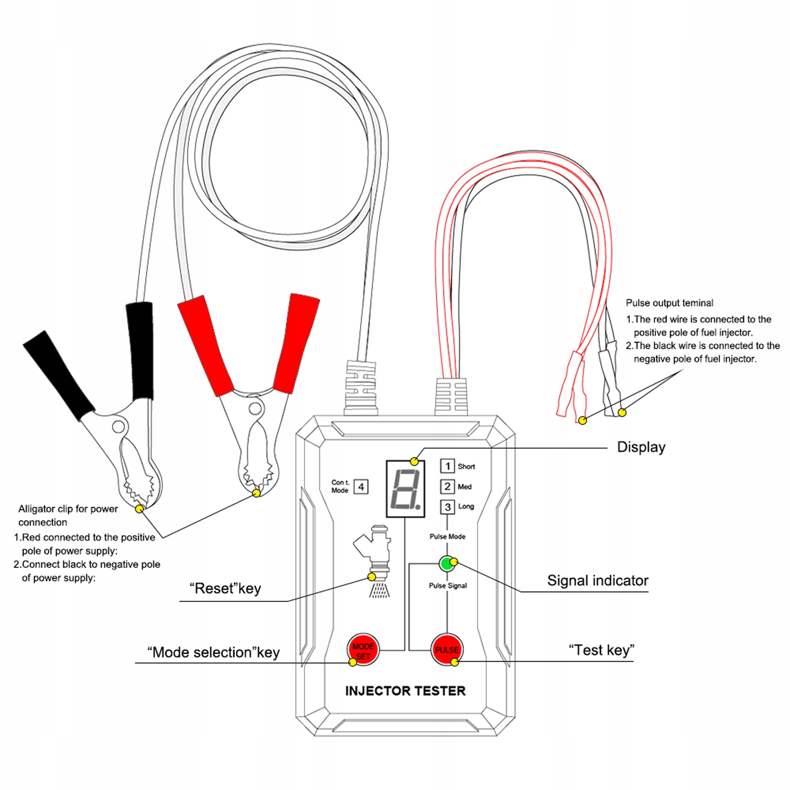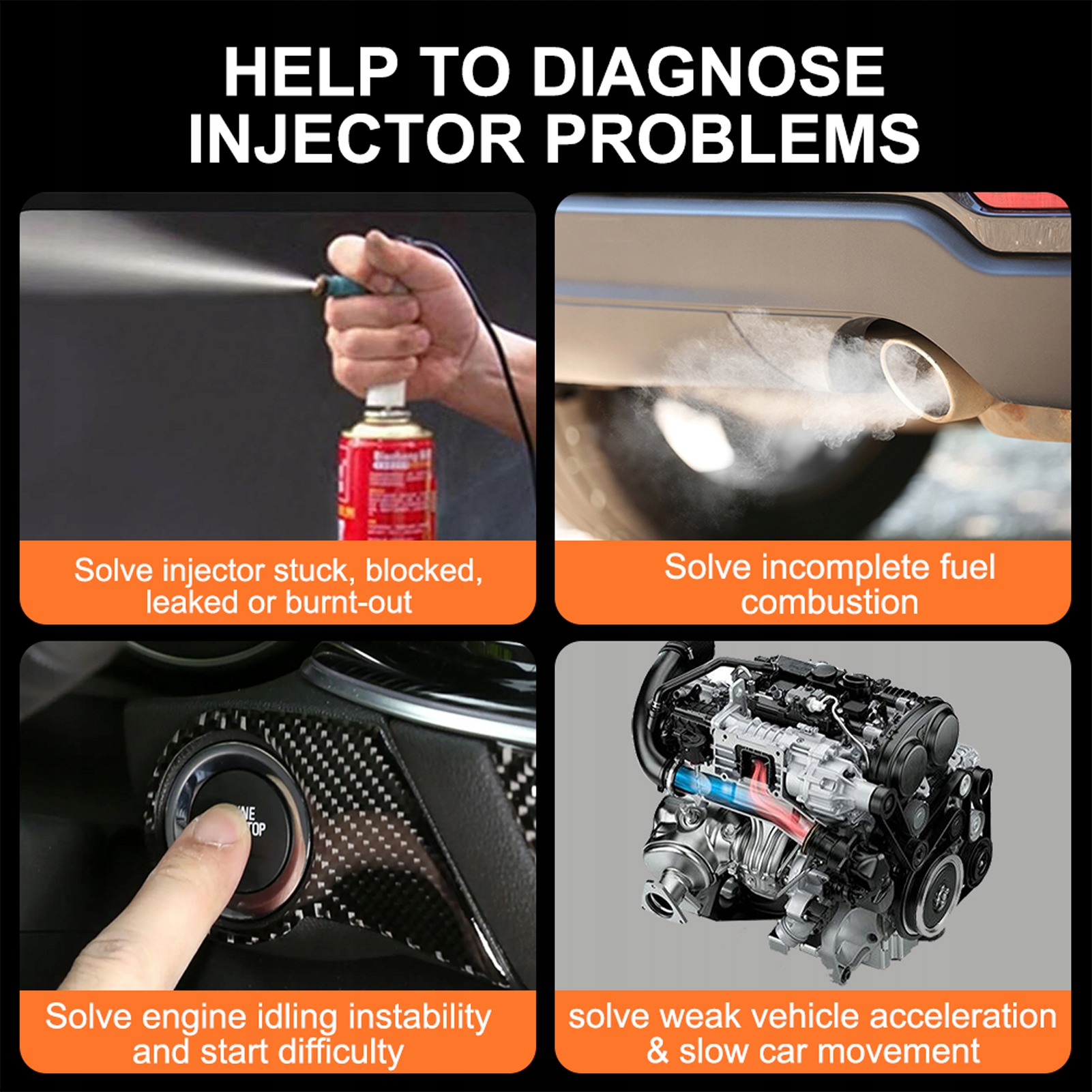 1. Перевірте 2 форсунки одночасно: тестер для очищення паливних форсунок може допомогти вам діагностувати та очистити форсунки, легко визначити загальні несправності, такі як застрягання, застрягання, витік або перегорання паливних форсунок. Порівняно з іншими засобами для чищення та тестування паливних форсунок лише з однією парою імпульсних вихідних клем (чорна та червона тестові частини), наш тестер паливних форсунок має 2 імпульсні вихідні клеми (дві пари тестових частин), які можуть перевіряти дві паливні форсунки одночасно для порівняння.