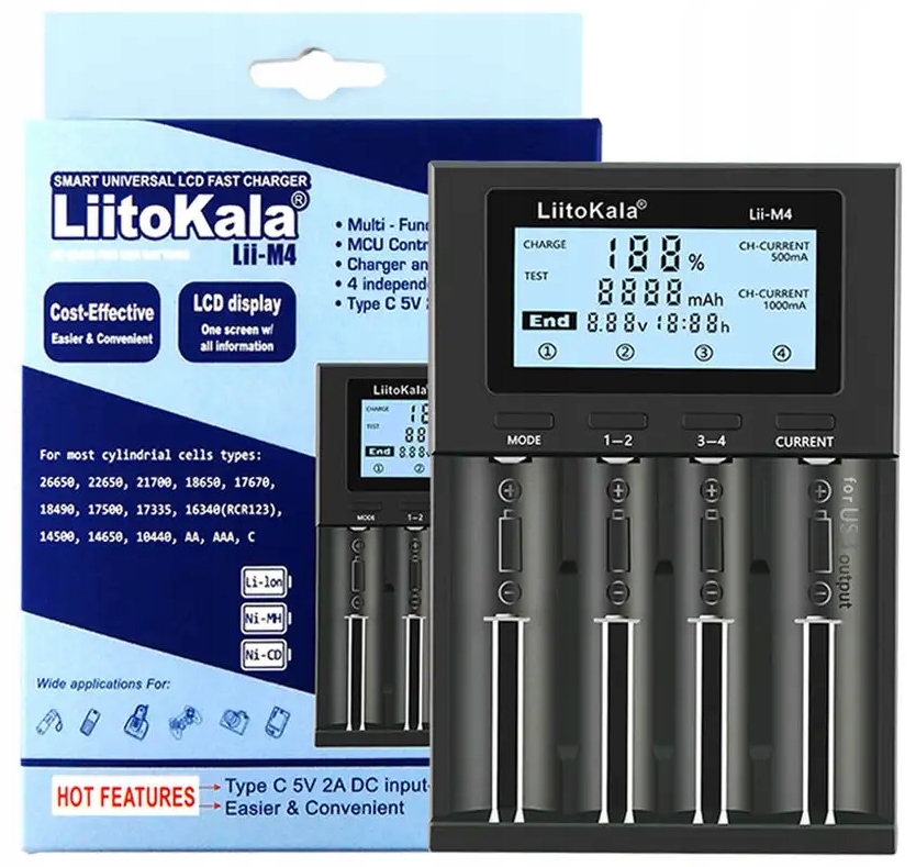 Універсальний зарядний пристрій Lii-M4може заряджати та розряджати більшість літій-іонних, Ni-MH, NiCd акумуляторів.