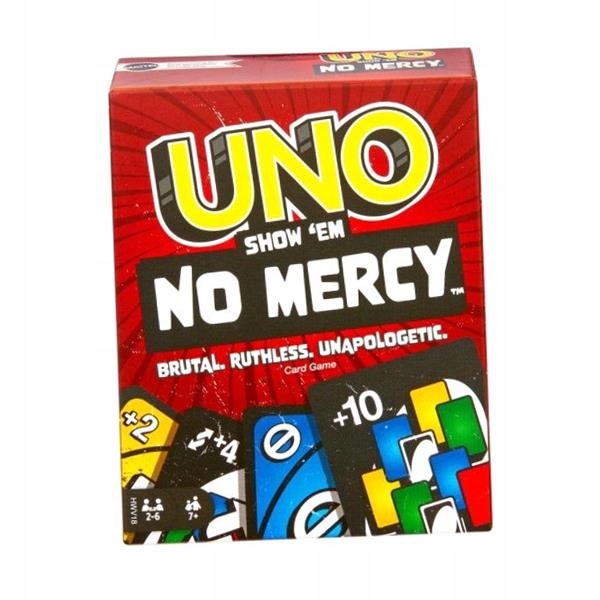 UNO No Mercy має 56 додаткових карток, спеціальні правила та дуже суворі особливі картки, які разом створюють найнапруженішу гру UNO.