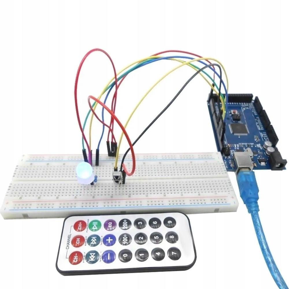 ➡ набору програм Arduino з UNO R3. з батареями R6. Система встановлена на контактній дошці і не потребує паяльних робіт. Ми можемо зробити багато ланцюгів за допомогою світлодіодів, світлодіодів, ІЧ -пілотів, зумерів тощо