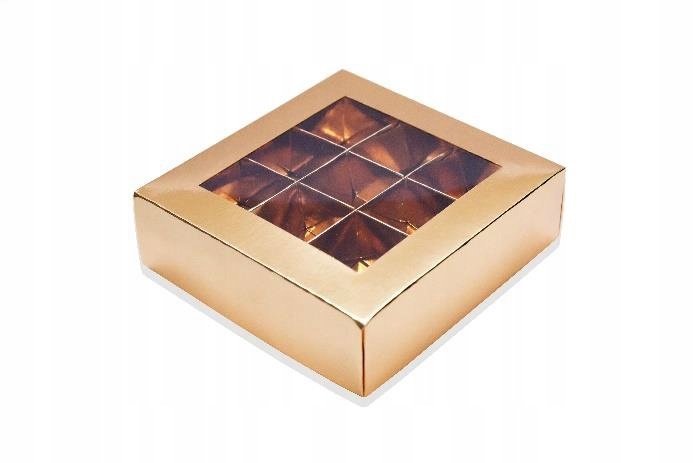 Коробка з високоякісного картону GOLD. Кришка має віконце, яке ідеально відображає 9 штук праліне, трюфелів і шоколаду.