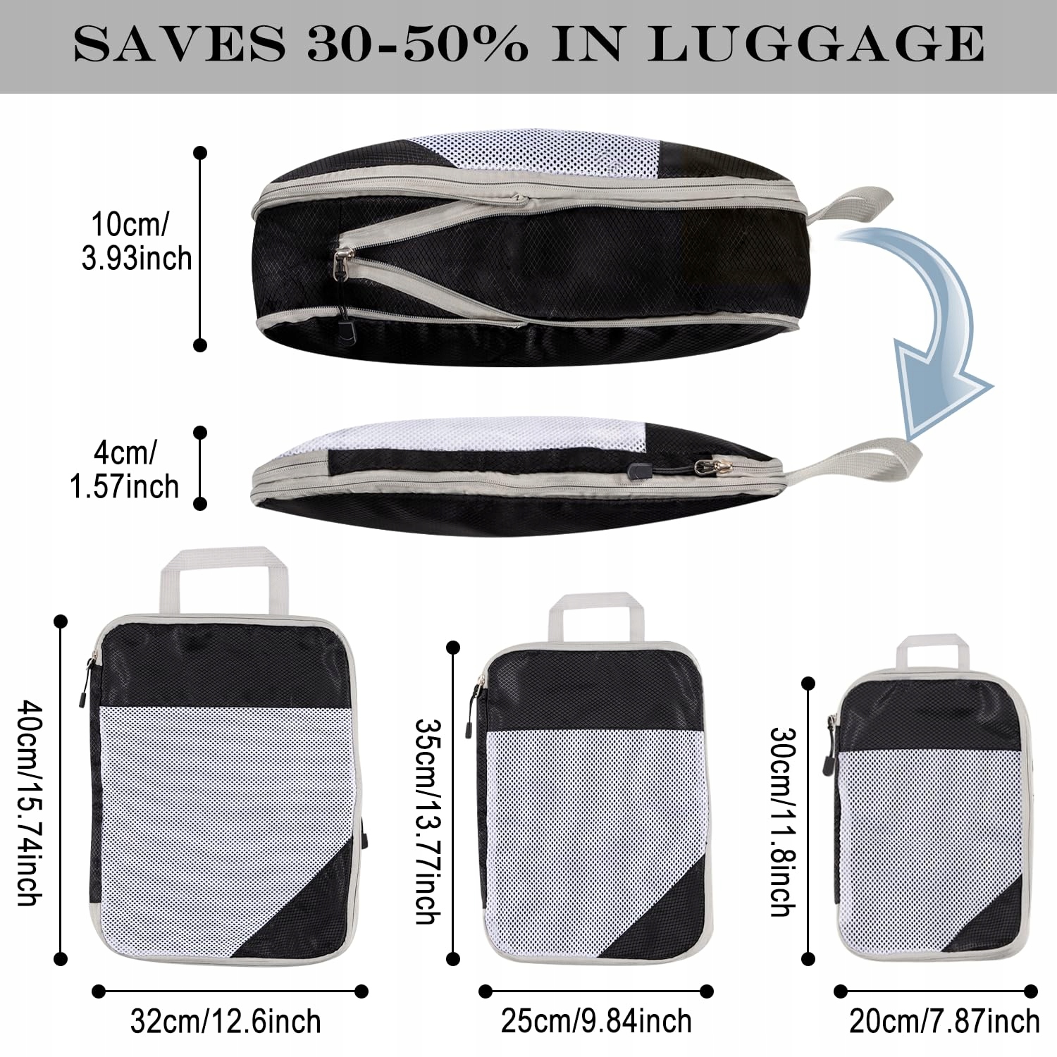 Різні розміри: невеликий розмір: 30 х 20 см/11,8 х 7,87 дюйма, середній упаковка розмір куба: 35 х 25 см/13,77 х 9,84 дюйма; Великий розмір куба упаковки: 40 х 32 см/15,74 х 12,6 дюйма. Заощаджуйте до 30-50% місця, стискаючи кубики упаковки через зовнішні прес-блискавки та створюючи більше місця у вашому багажі.