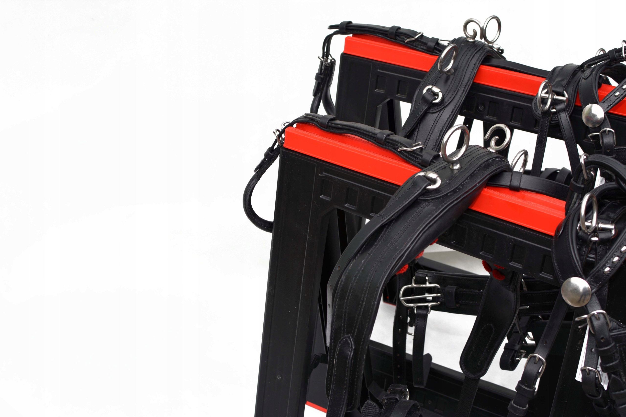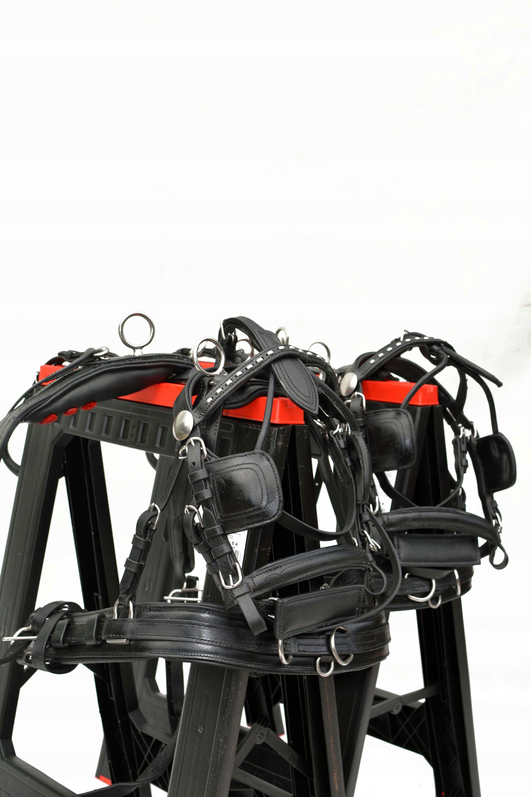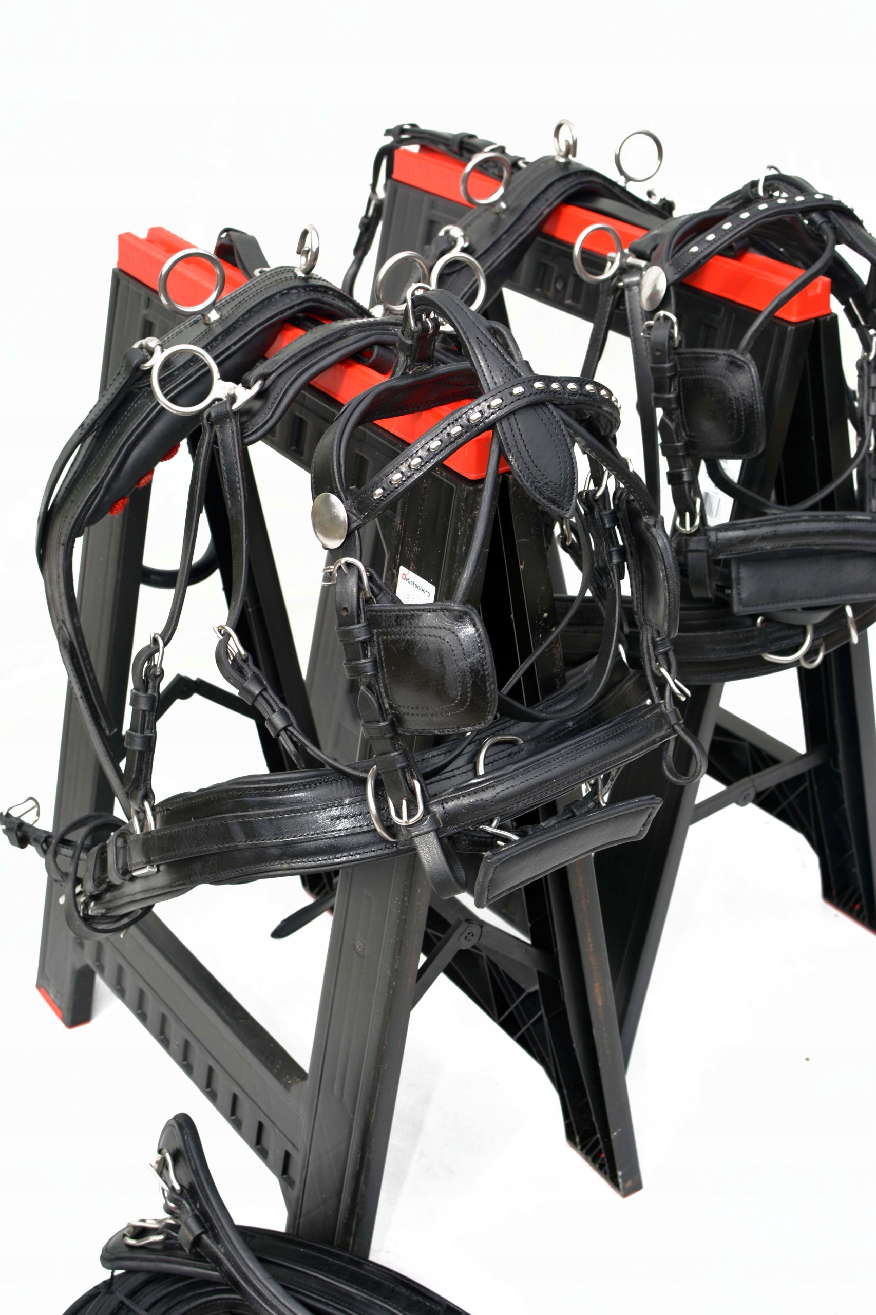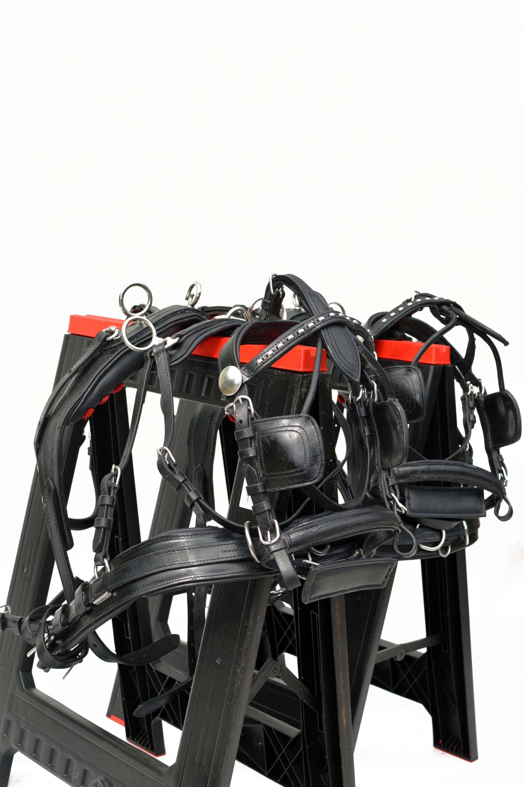 Збруя для пари поні. Упряж виготовлений повністю з дуже якісної, добірної суцільнозернистої шкіри преміум-класу, дуже м'якої та приємної на дотик, з вшитою стрічкою у всі елементи упряжі для зміцнення шкіри в потиличній частині і м'яка фурнітура з неіржавіючої сталі на ринку, ідеально виконана в коричневому або чорному кольорі.