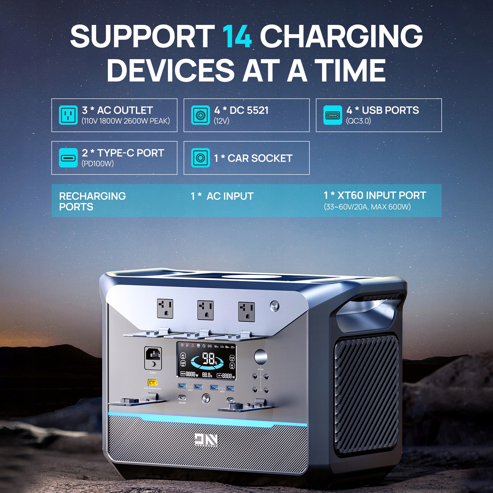 Універсальні параметри зарядки: 600 Вт -станція живлення має різні варіанти зарядки для розміщення різних пристроїв. Він оснащений портами 4*USB-A, 2*портами USB-C, більш легким портом, 4*DC5521 виводом та розеткою змінного струму, що дозволяє заряджати смартфони, планшети, ноутбуки, камери та навіть невеликі пристрої. Незалежно від того, який пристрій потрібно для живлення, ця портативна електростанція має універсальність для підтримки всього цього.
