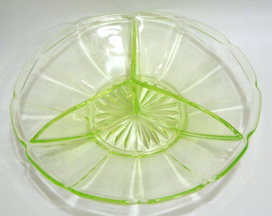 Красива, стара підставка для тортів кабаре з товстого зеленого скла. Скло, забарвлене з додаванням сполук урану, світиться зеленим світлом в ультрафіолеті,
