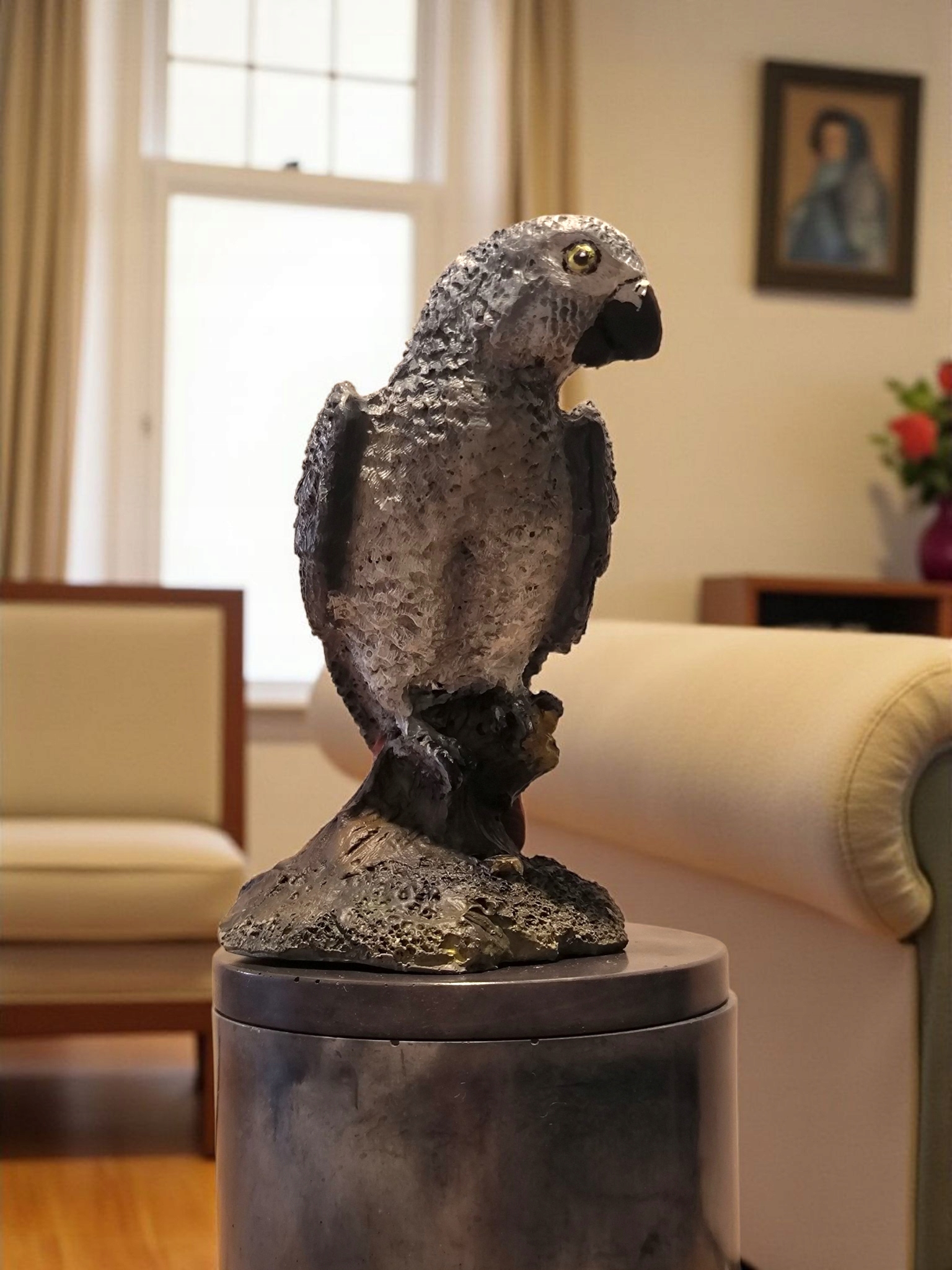Ця унікальна урна з фігуркою папуги була створена, щоб зберегти пам'ять про цього незвичайного супутника в красивій, символічній формі.