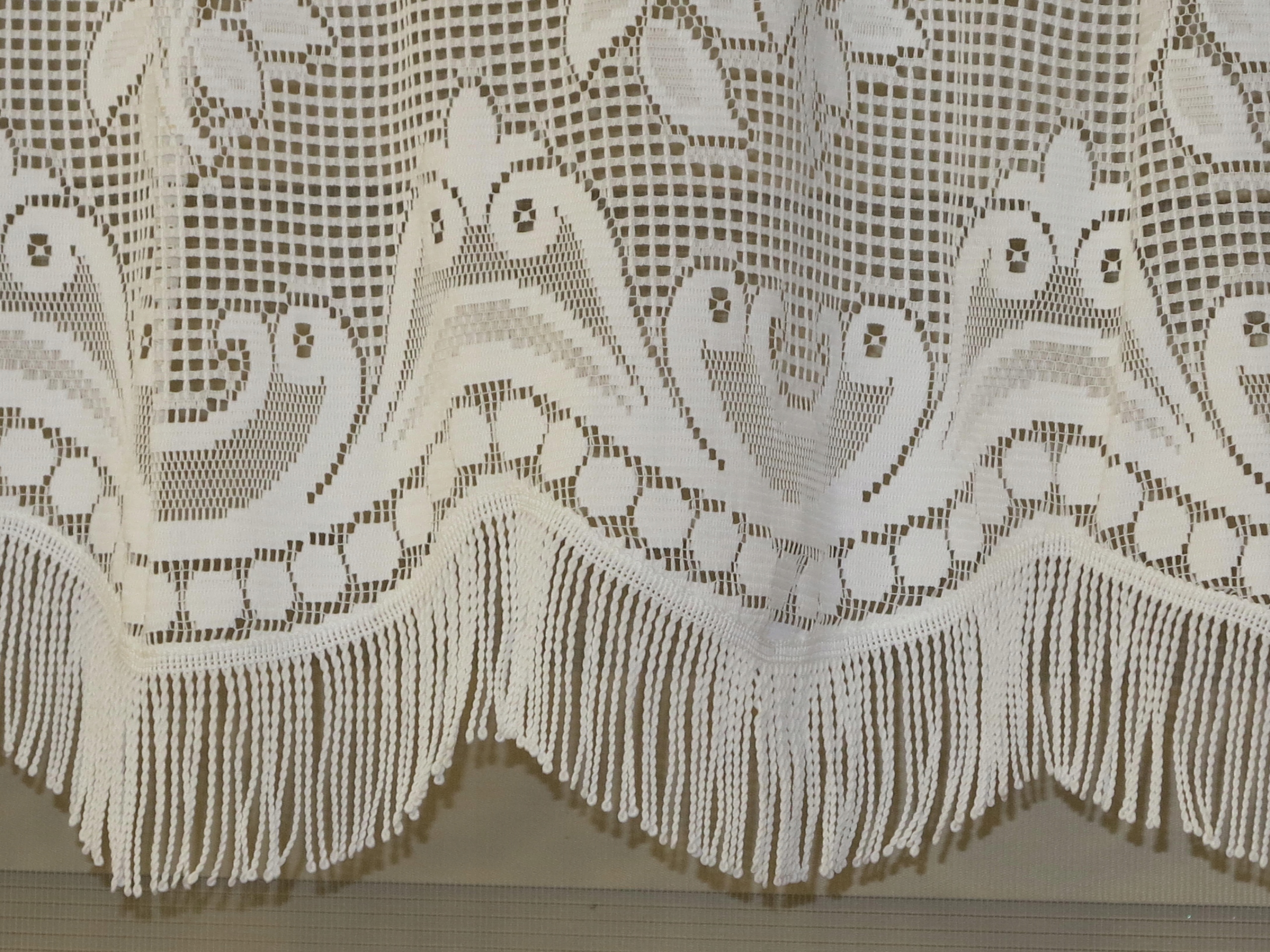 ЗАРЯДНИЙ АНГЛІЙСЬКИЙ МЕРЕЖИВНИЙ ВЕНЕЛЬ-КУРТ З ХВИЛЕНИМ НИЗОМ, ПРИКРАШЕНИМ ГУСТИМИ БАХОМРАМИ. КОЛІР ЧИСТО КРЕМОВО-БІЛИЙ