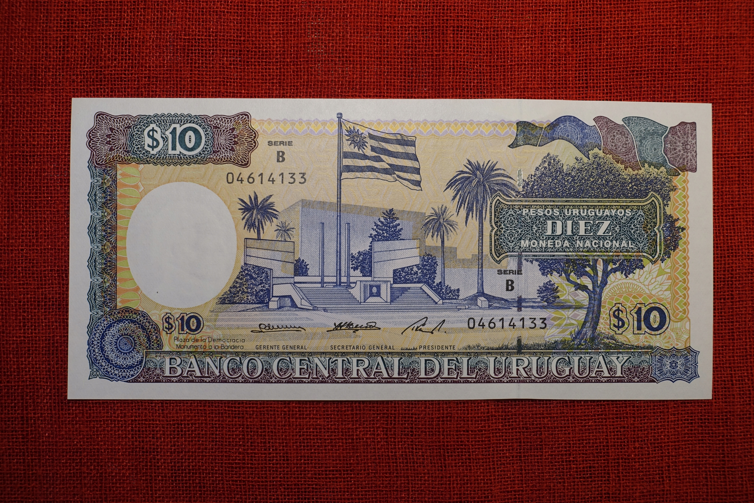 Продам банкноту УРУГВАЙ номіналом 10 ПЕСО випуску без вказівки року на купюрі (насправді 1995), кат. немає P-73Bb, серія A. Банкнота надрукована правильно (без напису «Decreto_Ley...»). Банкнота після деномінації та зміни назви валюти на PESO у 1995 році. Уругвайські банкноти каталогізовані досить специфічним чином - наступні випуски тієї ж банкноти зазвичай мають абсолютно новий каталожний номер, а закінчення номерів (a, b, c тощо) і серії (A, B, C тощо) збільшуються по відношенню до безпосередньо попереднього випуску. При його ідентифікації найкраще звернути увагу на рік випуску, але це стосується тільки купюр з номера П-66 (але також з винятками, як в даному випадку). Рік випуску не вказується на попередніх банкнотах.