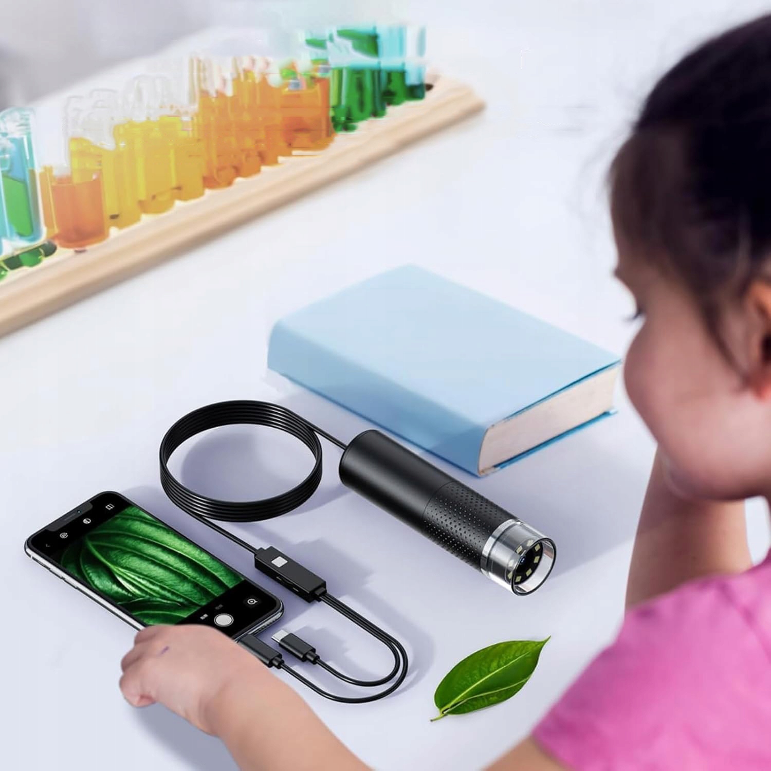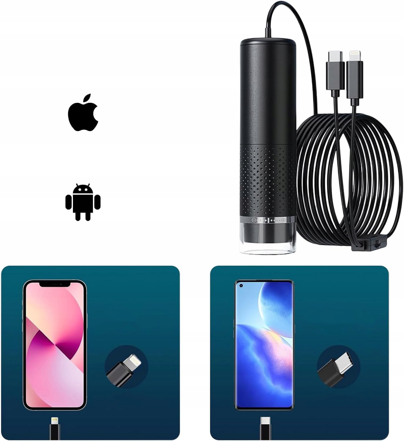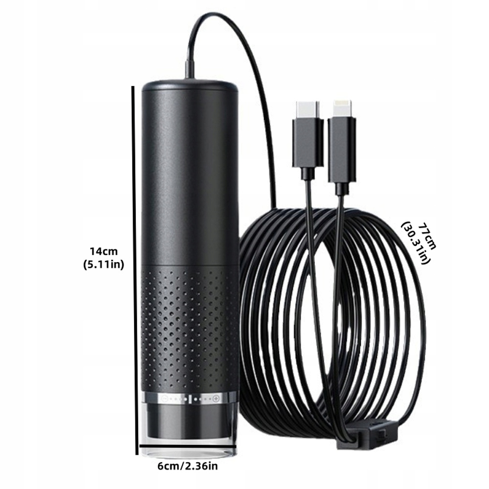- Цифровий мікроскоп із кабелем довжиною 77 см з портами iOS та USB для смартфонів та планшетів. Він не сумісний з ноутбуками та настільними комп'ютерами.