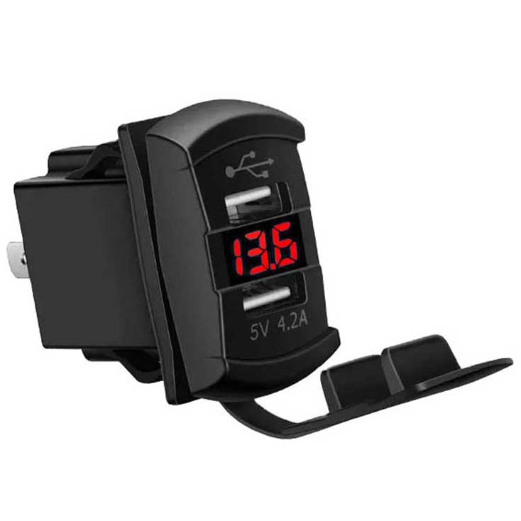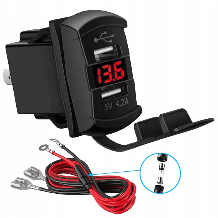яхт вольтметр з USB A Sockets, що дозволяє встановити в околицях комутаторів, наприклад. на яхт -розподільній пристрої. Швидка зарядка QC 3.0, легка збірка, червона світлодіодна підсвічування. Запобіжник і електричний промінь довжиною 60 см.