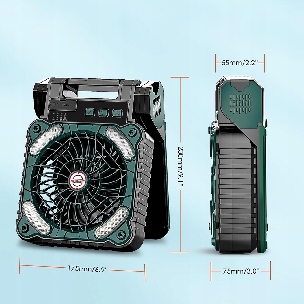 Вентилятор подорожі має розміри 9*6,9*2,9 дюйма (23*17,5*7,5 см) і важить 1,8 фунта, завдяки цьому простому перенесенню.