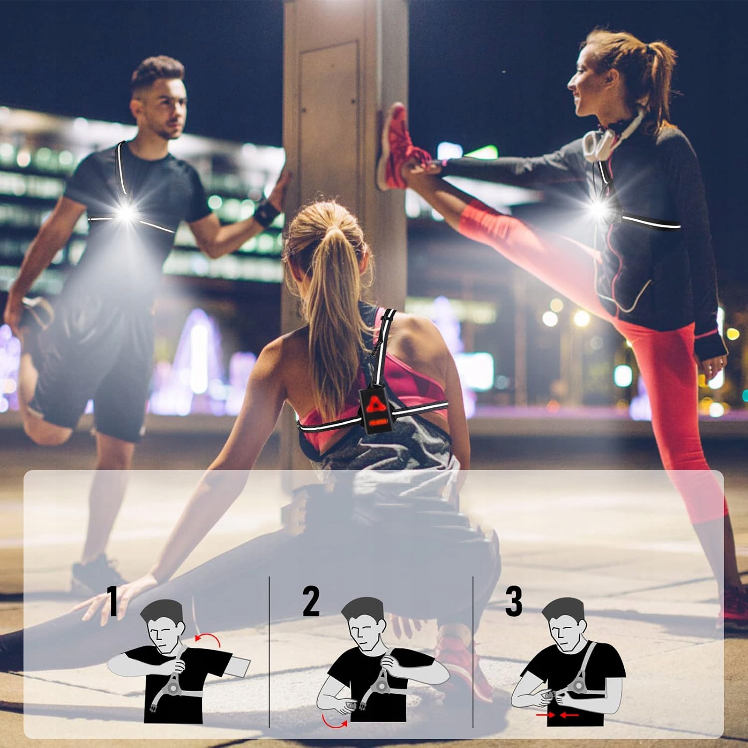 🏃♀️【Світловідбиваючі та регульовані ремені】Наш біговий ліхтар для більшості ранкових бігунів оснащено гнучким регульованим ремінцем для кріплення, який забезпечує зручну посадку для різних типи статури. Світловідбиваючі смуги забезпечують додатковий захист після білого світла спереду та червоного попередження ззаду, оскільки вони не лише роблять вас видимими для зустрічного транспорту, але й допомагають розпізнавати небезпеки на дорогах та дорогах.