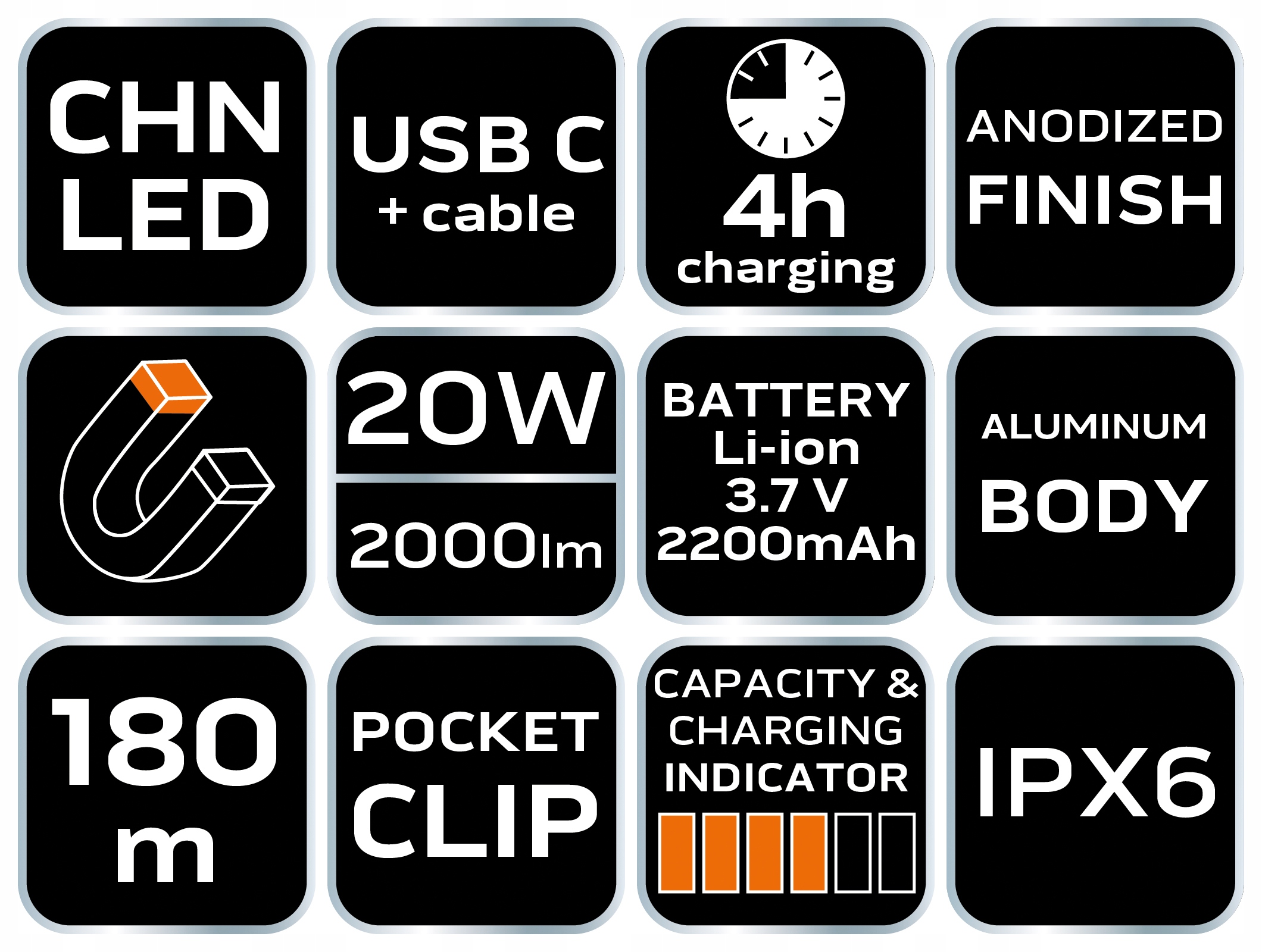 ліхтарик акумулятораUSB C 2000 LM CHN LED 99-067 Акумуляторний ліхтарик для акумулятора Neo Powered USB C з 2000 ЛМ та 20 Вт. Він має світлодіодний світлодіод CHN та світловий діапазон до 180 м. Ліхтарик характеризується п'ятьма режимами освітлення: 100% (робочий час максимум 20 сек), 30%, 10%, 3% та строб. Він працює за допомогою вбудованого літій-іонного акумулятора 3,7 В-потужність 2200 мАг. Він має індикатор зарядки та заряду акумулятора. Максимальний час освітлення - до 4 годин (а також час зарядки). Пристрій має алюмінієвий корпус з анодованою поверхнею. Практична кишеня та магніт полегшують транспортування ліхтарика.