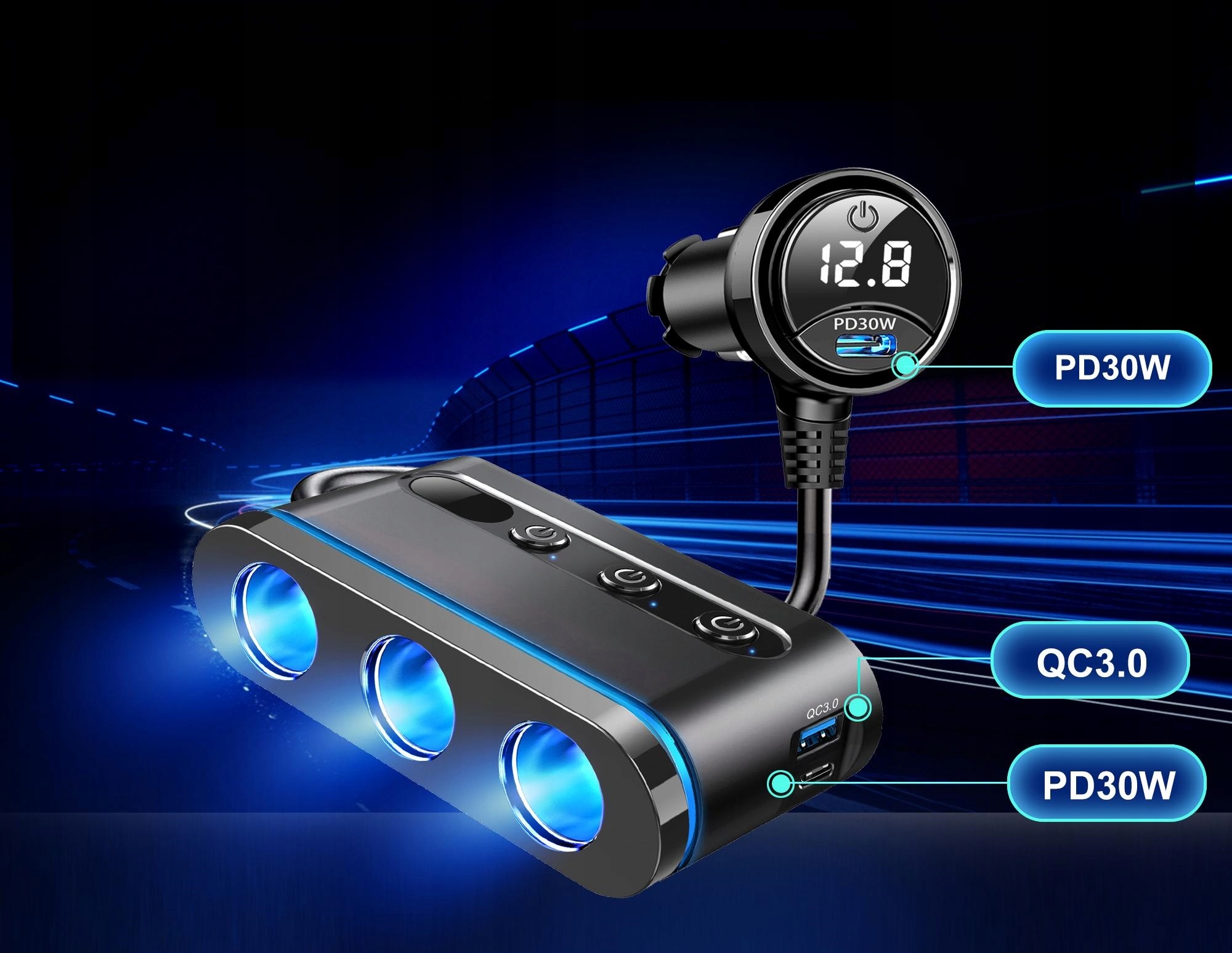 Дистриб'ютор автомобіля 3 x Сигаретна легша розетка + 2 x USB TYP-C + USB-LS09 ЗАРАЗ ОДИНУЮТЬ Кілька пристроїв