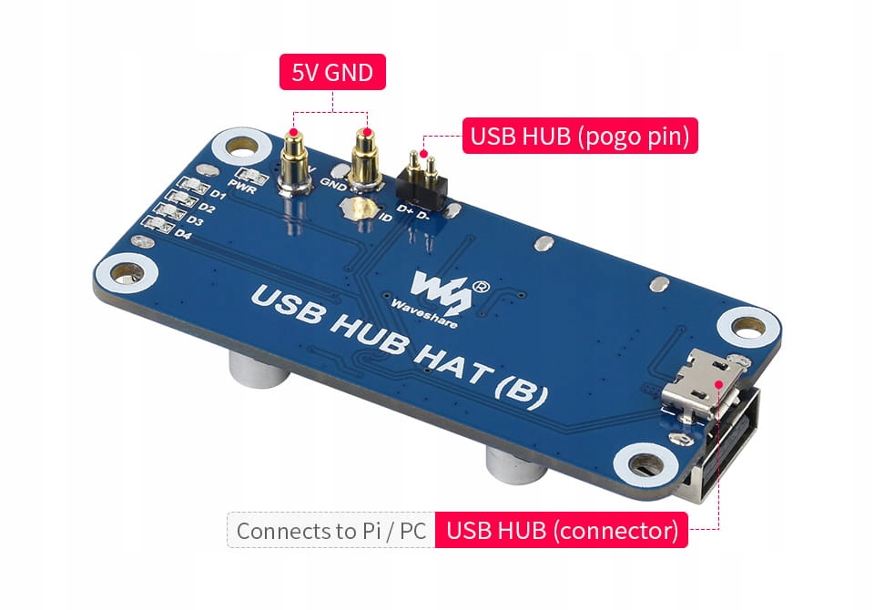 ⭐ USB HUB HAT (B) – це 4-портовий USB HUB, розроблений для Raspberry Pi. Його дизайн Pogo Pin спеціалізований для серії Zero, тоді як вбудований міні-роз’єм USB можна використовувати для підключення до інших плат Raspberry Pi або ПК через кабель USB.