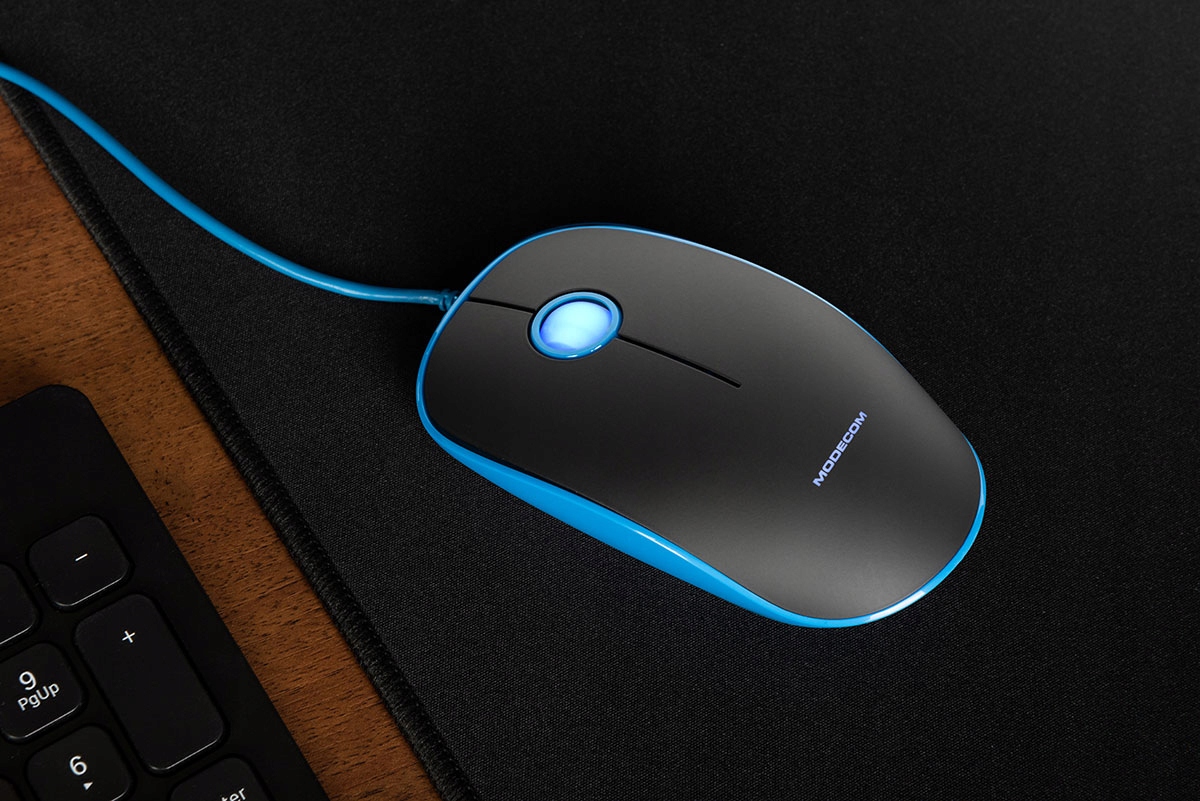 це високоякісна дротова оптична миша з надтихими перемикачами без класичного клацання. Стиль миші MODECOM MC-M111 вирізняється модельною рамою, яка підходить до будь-якої руки з характерним опущеним профілем і обтічної форми. Її чорно-синій корпус прикрашений сувоєм із синім підсвічуванням і логотипом виробника. Миша чудово працює як на світлих, так і на темних поверхнях. Поверхня миші виготовлена з приємного на дотик матеріалу, перевага якого полягає в тому, що на ній не залишаються відбитки пальців після використання. Ретельно підібраний розмір миші та її невелика вага гарантують комфортну роботу для більшість користувачів. Кабель довжиною 1,8 метра дозволяє легко керувати мишею в будь-якому середовищі.