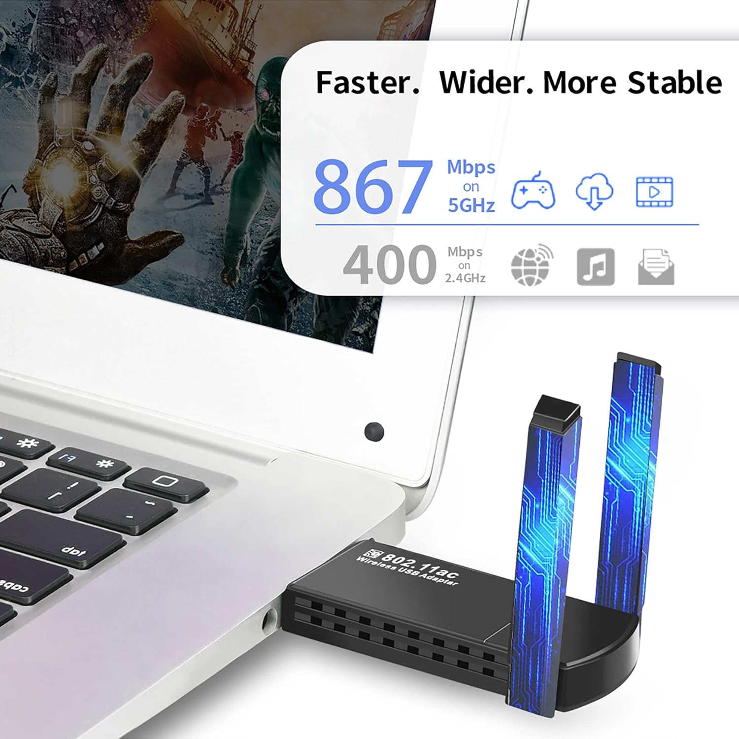 - Надшвидкісний дводіапазонний Wi-Fi зі швидкістю 1300 Мбіт/с: до 867 Мбіт/с у діапазоні 5 ГГц або 400 Мбіт/с у діапазоні 2,4 ГГц. Продуктивність, яка зменшує зависання та затримки під час трансляції та ігор.