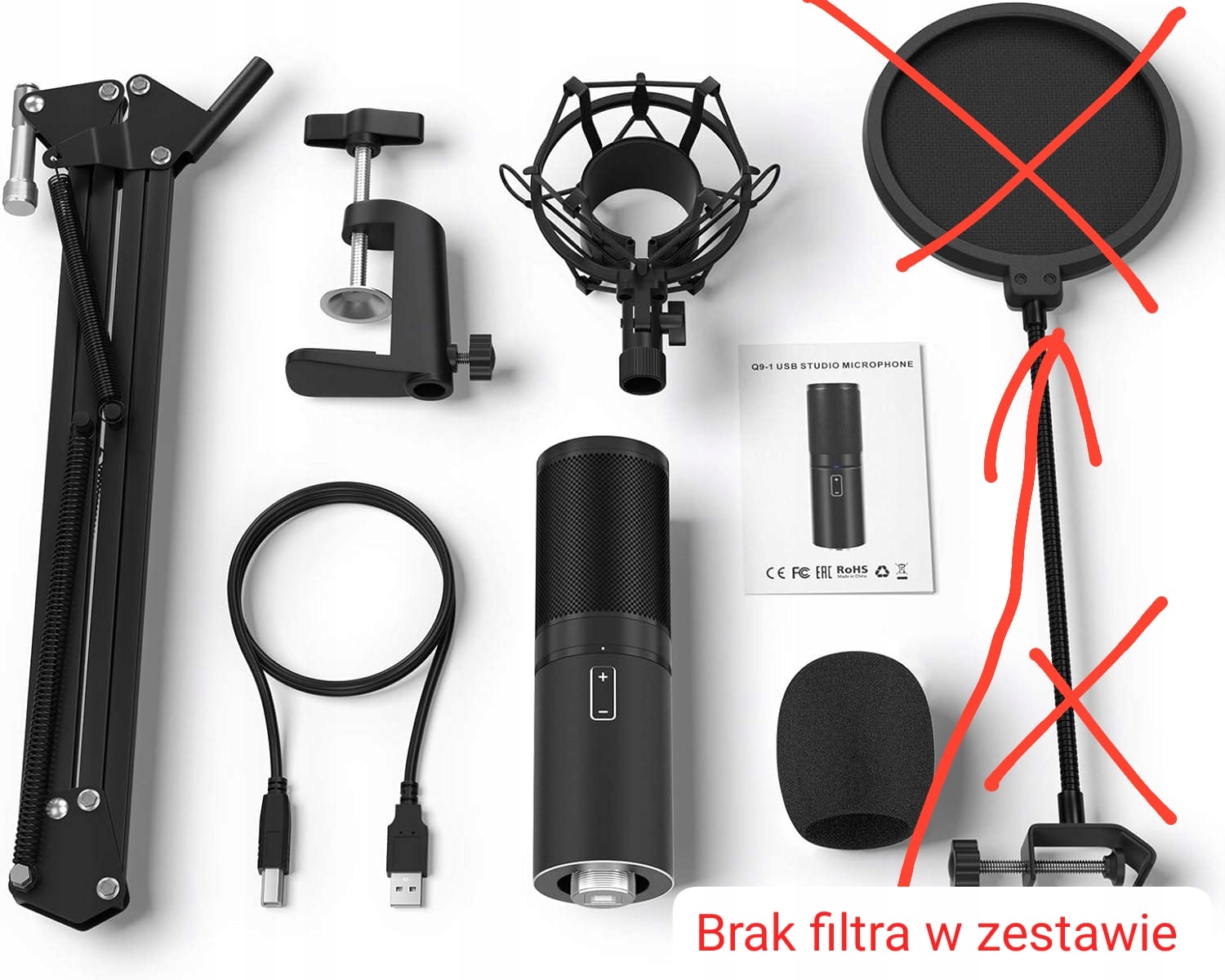 - Цінний стартовий набір: Не потрібно інвестувати в аксесуари для мікрофона. Окрім конденсаторного мікрофона, комплект Q9 включає регульовану штангу, металеве протиударне кріплення, затискач для настільного кріплення, поролонову кришку для мікрофона, кабель USB A–B довжиною 1,8 м та посібник користувача.