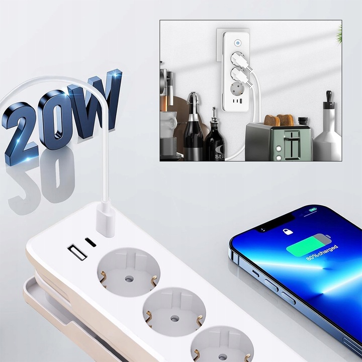 🔌🔌 Подовжувач живлення з 3 розетками, з 3 розетками стандарту ЄС (макс. 250 В 16 A), 1 USB-портом і 2 роз’ємами типу C (швидка зарядка PD20W) і подовжувач живлення для настінного монтажу зі світлодіодним вимикачем і подовжувачем 1,5 м шнур.
