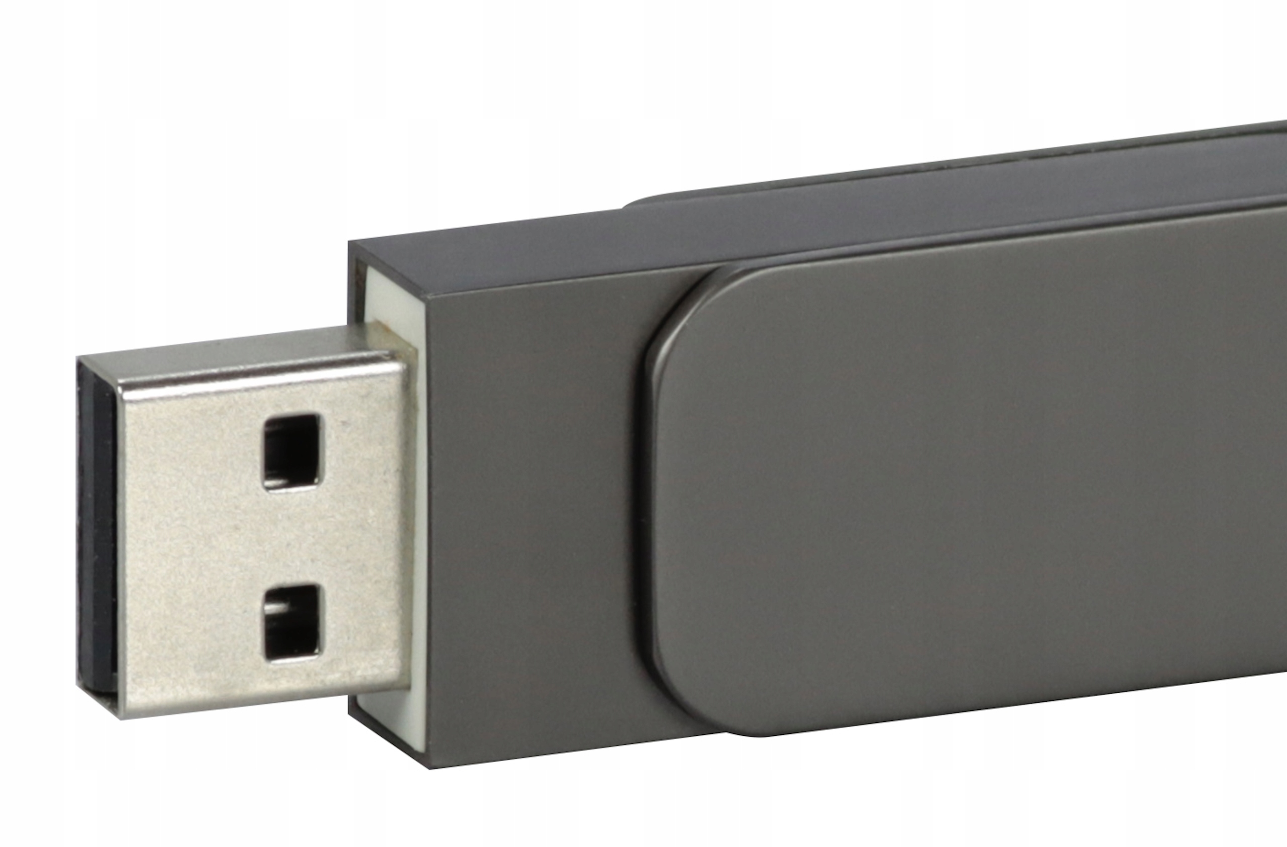 Класичний, з позачасовою формою, USB -пам'ять, виготовлена з металу в двох відтінках кольору - сріблясто -графіту. Елегантна, атласна поверхня корпусу приваблює розміщений логотип привабливо. Має обертове закриття з практичними вухами.