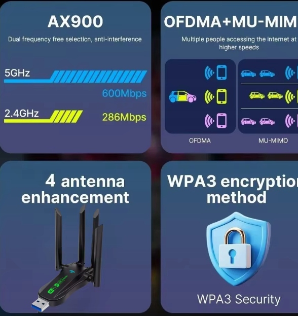 Дводіапазонний бездротовий мережевий USB-адаптер AX900BT5.4 підходить для бездротового підключення настільних комп’ютерів та інших пристроїв і може забезпечити зручний і швидкий бездротовий доступ до Інтернету. Мережевий адаптер підтримує функцію автоматичного визначення та може автоматично регулювати швидкість