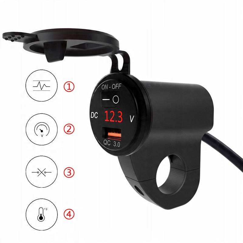 ЗАРЯДНИЙ ПРИСТРІЙ ДЛЯ МОТОЦИКЛА USB QC3.0 КНОПКА ВОЛЬТМЕТРА - чорний