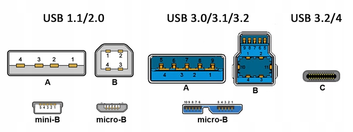 Straindard USB (Універсальна серійна автобус - Універсальний серіальний майстер) був представлений у 1998 р. Специфіки USB1.0/1.1, пізніше USB2.0, USB 3.0/3.1 та останні USB 3.2/4 DEFINORS, не вигадані, як не вистачає USB 3.2 USB 3.2/4 USB. В даний час тип типу USB2.0 типу A, B та Mikro-B, USB3.0/3.1 типу A та USB3.2/4 типу C.
