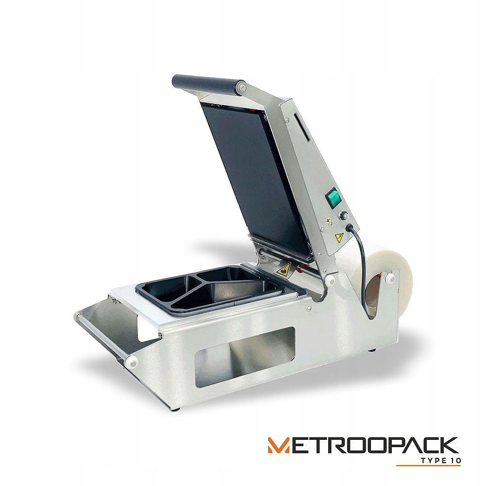 Зварювальний апарат METROOPACK T10 виготовляється з дуже твердих матеріалів, наприклад, товстого листового металу виготовлений із нержавіючої сталі та зварювальної пластини з тефлоновим покриттям, вбудованої в спеціальний герметичний сталевий корпус, який запобігає потраплянню рідини всередину машини. Широка рукоятка дозволяє легко досягти відповідного тиску на зварену фольгу, забезпечуючи достатній тиск і найкоротший час зварювання упаковки з усіх машин подібного класу, доступних у Польщі. Правильно встановлений загартований ніж гарантує легкий розріз навіть дуже товстої зварюваної фольги. Трейпакувальна машина METROOPACK T10 має достатні розміри, щоб дозволити розміщення матриць відповідного розміру для найбільшої упаковки, яка використовується в гастрономії для пакування страв на винос, і дозволяє зварювати навіть кілька менших упаковок той самий час. Розміри зварювального апаратуMETROOPACK T10 підібрано таким чином, щоб його можна було легко розмістити на будь-якій кухонній стільниці. У цьому зварювальному апараті корпус зі зварювальною пластиною автоматично піднімається за допомогою двох твердих пружин, що значно прискорює і полегшує роботу оператора. Дуже важливою функцією цього рішення є запобігання спонтанному падінню клапана з нагрітою пластиною, що запобігає опікам або травмам. Температура регулюється за допомогою ручки, розташованої в корпусі зварювального апарата. Ця машина має європейські сертифікати безпеки.