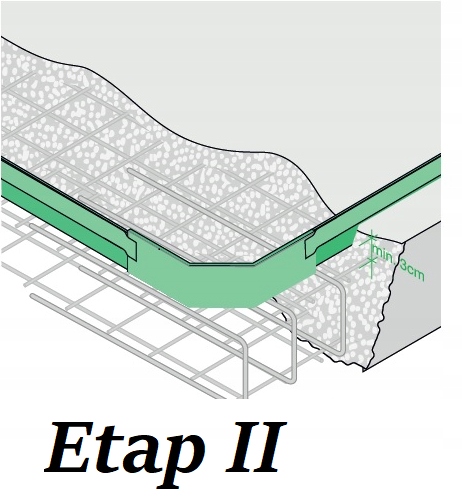 Найпоширенішим застосуванням є з’єднання плита фундамент – стіна або плита – стіна. Для цього стрічку кладуть на арматуру фундаменту або плити, стабілізують спеціальними хомутами, знімають захисну плівку і заливають не менше 3 см бетону. Стрічка розташовується так, щоб покриття було спрямоване до можливого тиску води (біла стрічка до зовнішнього краю будівлі). На другому етапі ми бетонуємо стіну, не забуваючи про видалення захисної плівки.