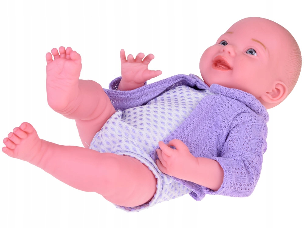 Усміхнена дитина у фіолетовому светрі та шапці відображення чудового малюка, яке викличе посмішку на обличчі вашої дитини. Лялька одягнена в боді, светр, шкарпетки і шапочку. Фіолетовий светр з шапкою і шкарпетками чудово поєднується зі світлим боді в фіолетові цятки. Одяг був ретельно виготовлений з великою увагою до деталей, що ще більше підкреслює реалістичність і чарівність цієї унікальної іграшки.