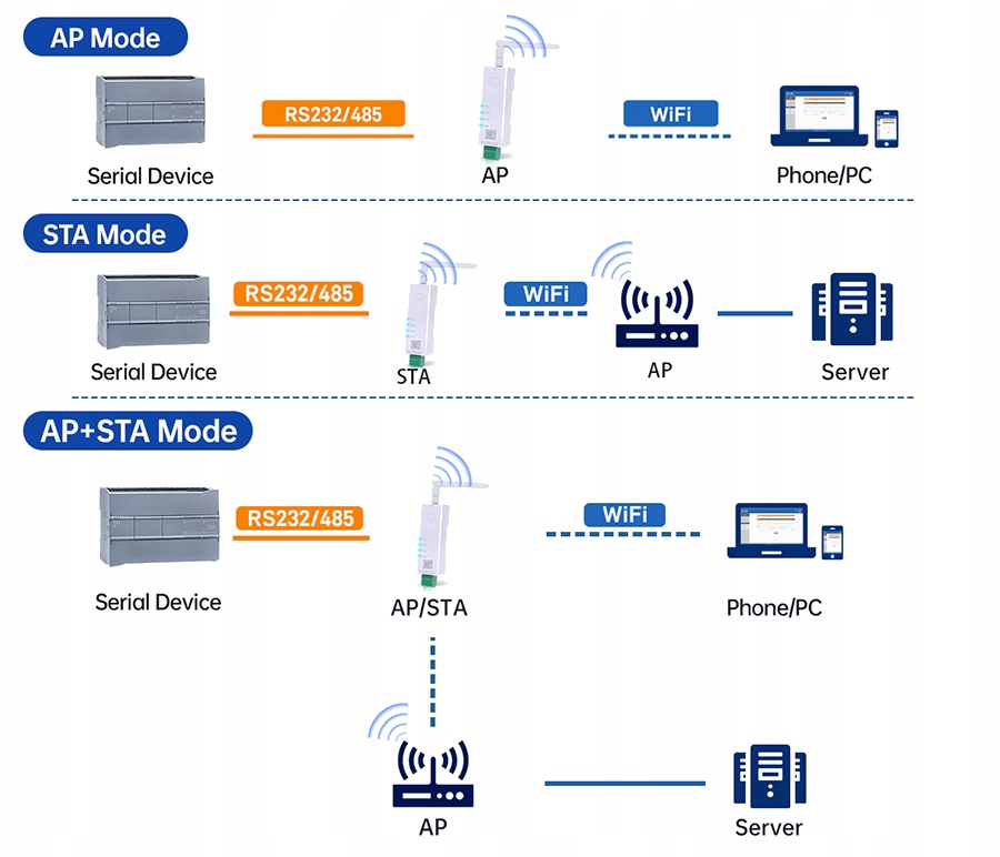 • sta режим: usr-dr164/162 підключається з іншими мережами як мережа. AP+STA: Одночасна дія в режимі AP та STA, пропонуючи гнучкі параметри з'єднання.