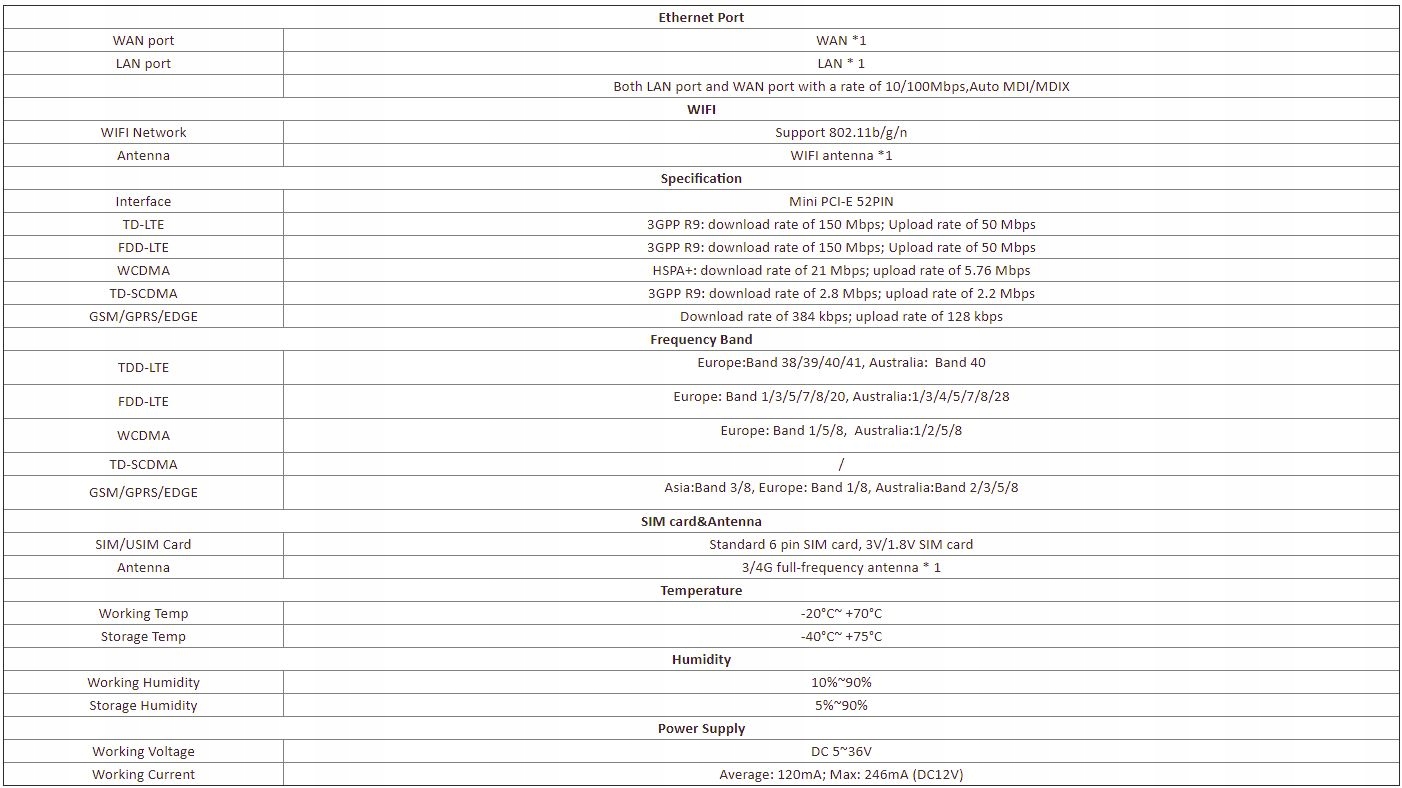 - FDD:B1/2/3/5/ 7/8/20, TDD: B38/40/41, HSPA/UMTS: B1/2/5/8, GSM/EDGE: B2/3/5/8