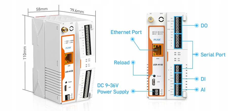 USR-M100 має унікальну механічну конструкцію, яка скорочує час, необхідний для встановлення та видалення, що спрощує розгортання та обслуговування. Крім того, USR-M100 підтримує протокол Master Modbus RTU для збору послідовних даних із поля та підтримує перетворення протоколу OT/IT.