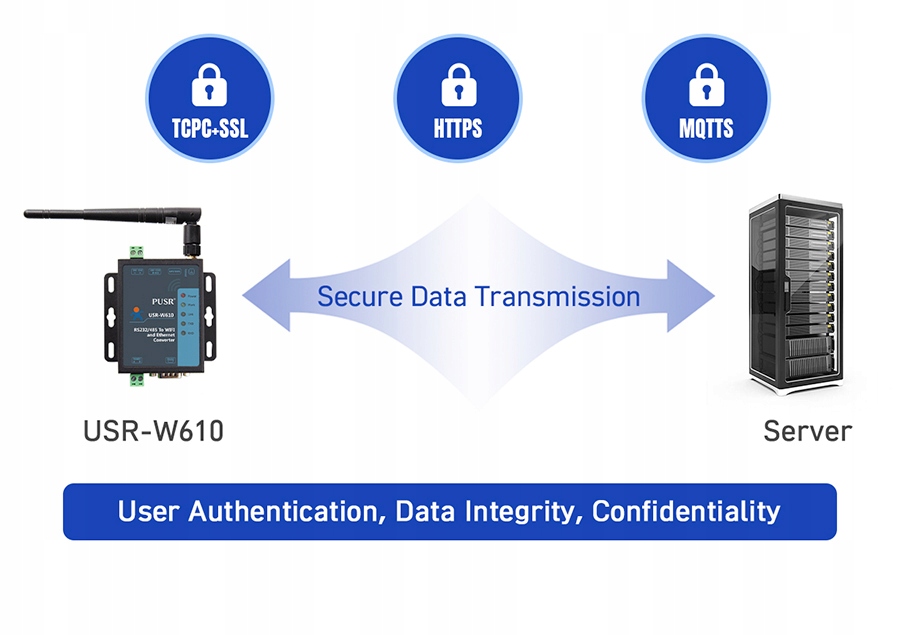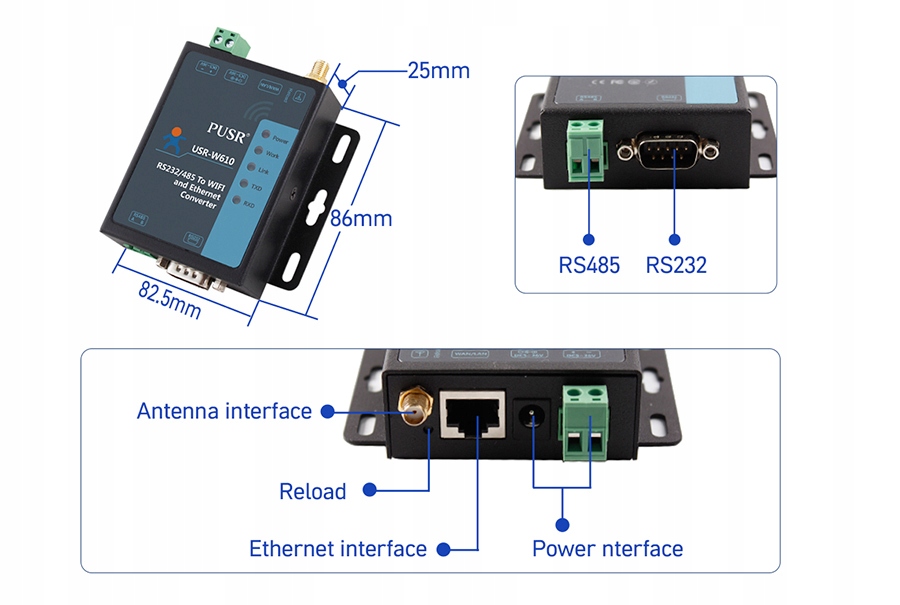Конвертер RS232 / RS485 в WiFi / Ethernet, який використовується для прозорої передачі даних. USR-W610 промисловий перетворювач, завданням якого є здійснення бездротової двосторонньої прозорої передачі між послідовним портом і мережею WiFi та/або Ethernet. Конвертер внутрішньо інтегровано з протоколом TCP/IP.