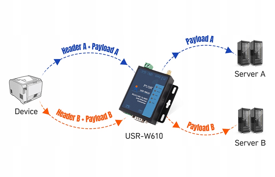 У цьому режимі USR-W610 має працювати як UDP-клієнт або TCP-клієнт, це дозволяє користувачам надсилати послідовні дані на різні сервери. Дані, IP-адреса сервера та інформація про порт мають міститися в пакеті даних, надісланому послідовним пристроєм