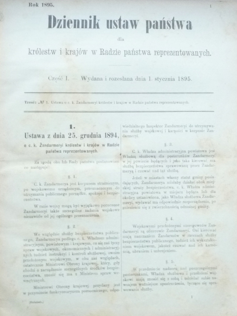 USTAWA o c.k. Żandarmeryi królestw i krajów w Radzie państwa reprezento1895