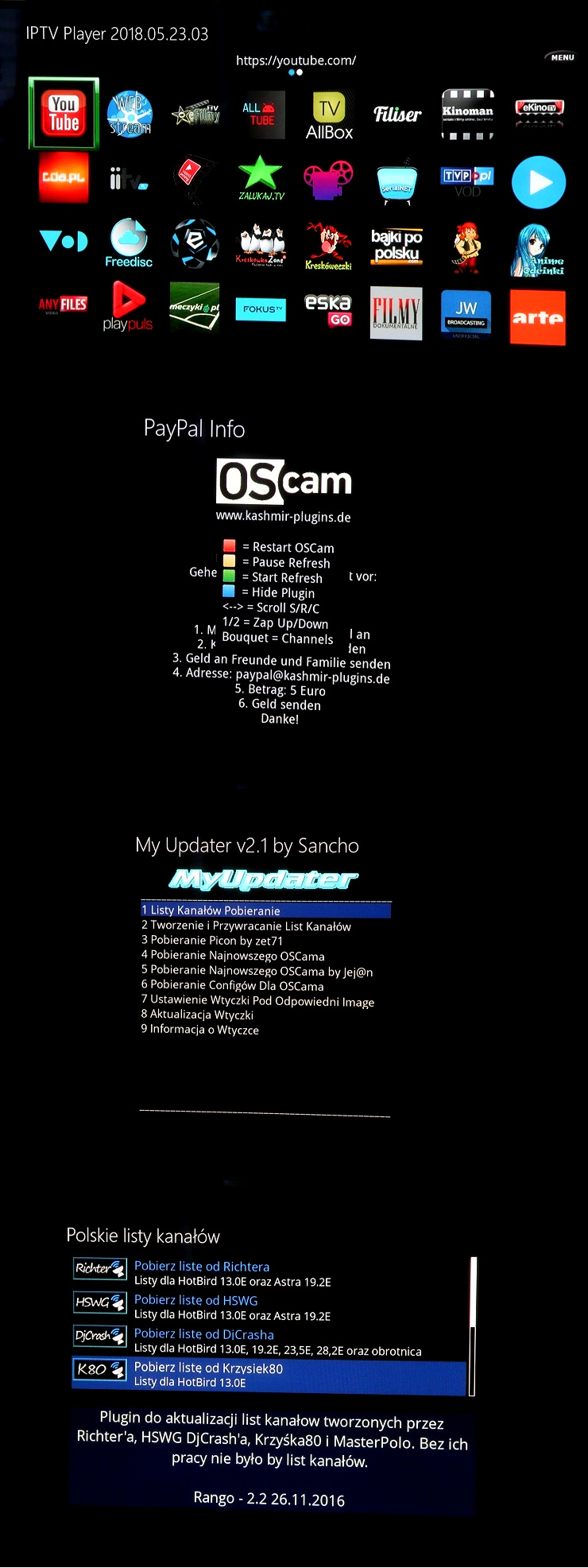 Програмне забезпечення має плагін MyUpdater, який дозволяє завантажувати списки каналів, піктограми, найновішу версію oscam і конфігурації oscam для правильної роботи карток або спільного доступу до домашньої сторінки.