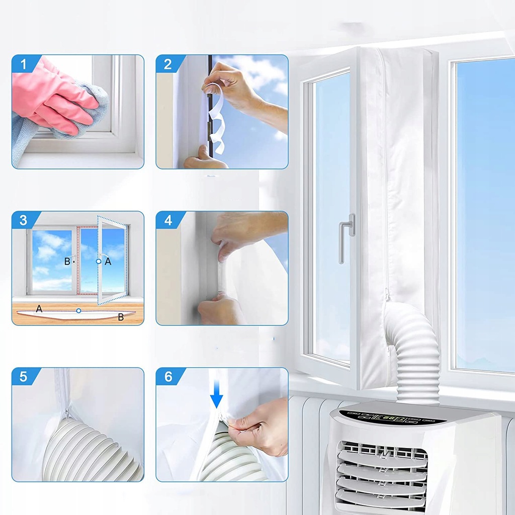 - 🧊【Блискучий інноваційний віконний ущільнювач повітряного шлюзу】: Просто наклейте самоклеючу стрічку-гачок на внутрішню частину віконної рами та на саме вікно. Прикріпіть віконний ущільнювач до гачкової стрічки. Потім відкрийте блискавку на віконному ущільнювачі та витягніть шланг кондиціонера з вікна. Насамкінець щільно закрийте шланг.