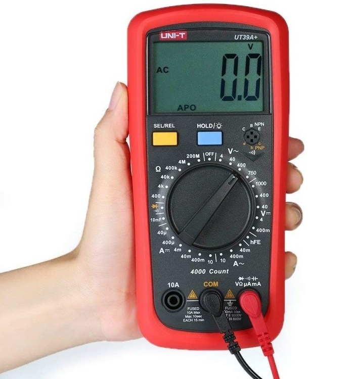 Лічильник UNI-T UT39A+ – це портативний глюкометр, оснащений РК-дисплеєм. Має функцію «HOLD». Він вимірює змінну/постійну напругу (AC/DC), струм, змінну та постійну напруги, опір, ємність, транзистор, діод і безперервність ланцюга.