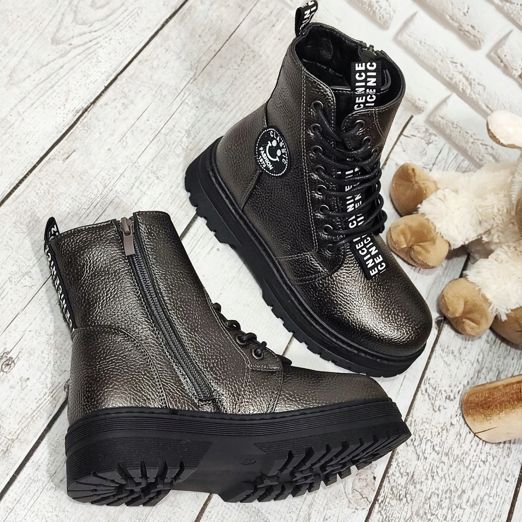 Ці черевики — ідеальний вибір для дівчат, які люблять моду та комфорт. Виготовлені з екошкіри найвищої якості, вони поєднують стиль із практичними рішеннями. Товстий флісовий утеплювач забезпечує тепло, а більш товста нековзна підошва з глибоким протектором забезпечує безпеку на слизькій поверхні. Характерна мереживна застібка та додаткова блискавка - це поєднання стилю та комфорту.