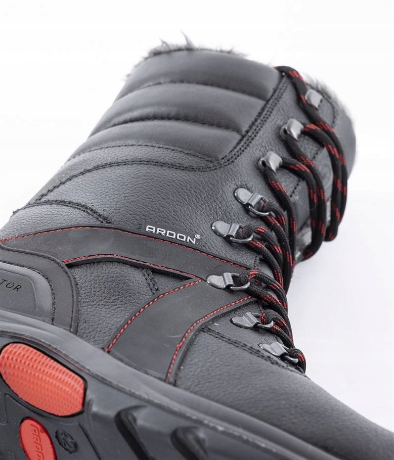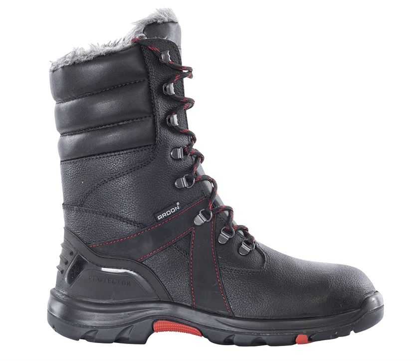 Водостійкий верх з натуральної шкіри з візерунком SPLIT LEATHERз гідрофобним просоченням, посилення в п'ятковій частині. Всередині дуже тепле синтетичне хутро і змінна устілка BASIC підвищують комфорт використання, щоб ноги не втомлювалися. Взуття забезпечує тепловий комфорт і захищає від холоду до -17°C. Поглинання енергії в області п'яти. Взуття також має сталеву антиперфораційну вставку, яка захищає від проколів гострими предметами землі. Для кращого захисту пальців взуття оснащено ударостійким сталевим підноском. Регулювання за допомогою шнурків, протягнутих через металеві вушка. Підошва з поліуретану/гуми подвійної щільності з характерним протектором має антистатичні, протиковзкі властивості та стійка до масел, бензину та інших розчинників. Дуже дизайнерське зимове взуття до середини ікри привабливого чорного кольору з контрастними швами, підходить для важкої та легкої промисловості. Рекомендовано будівельникам, дорожникам, складським працівникам і механікам. Поєднання передових технологій і комфорту користувача.