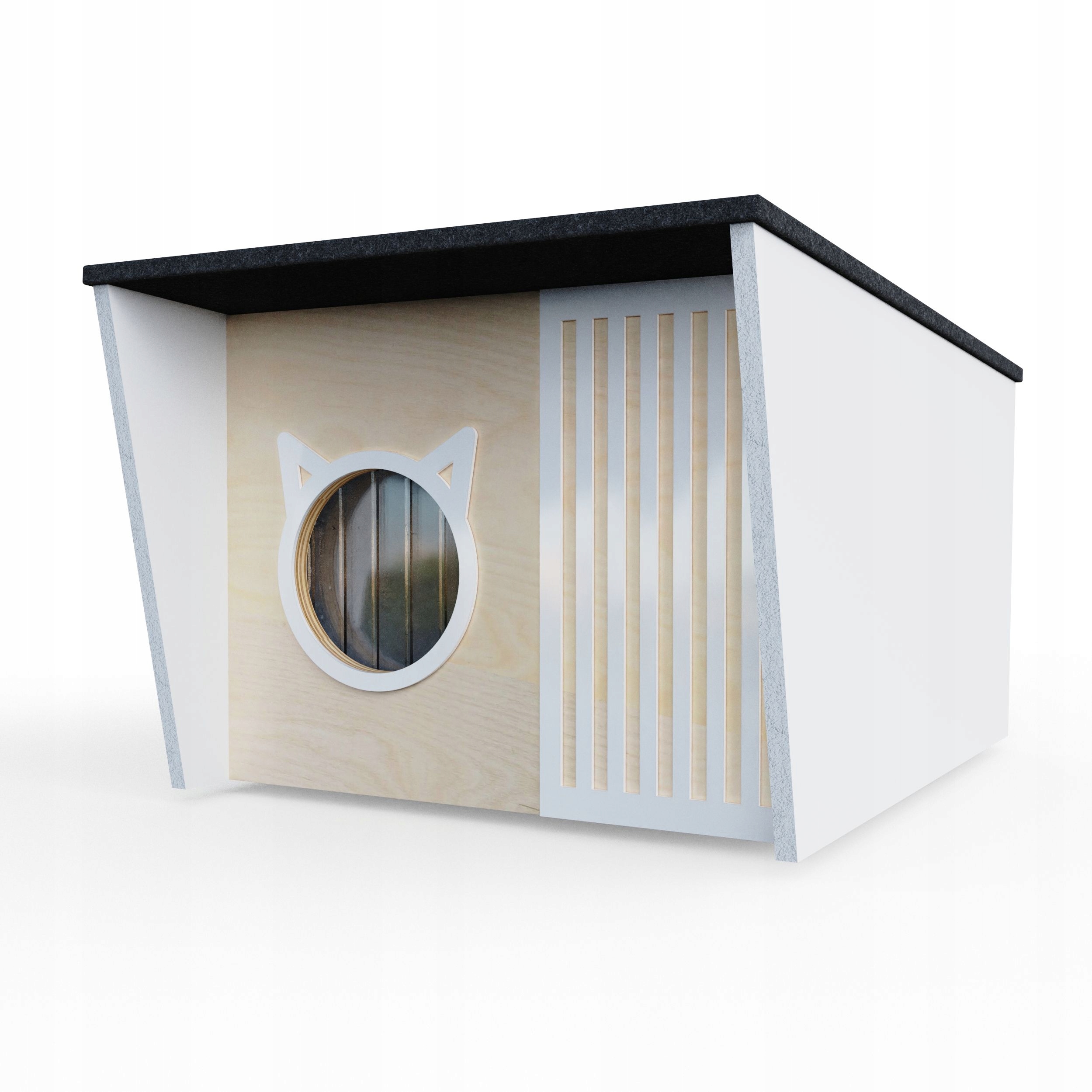 Бурка герметична. Захищає від вітру, дощу, снігу та морозу. Його дах відкривається. Тут можуть розміститися мінімум 2 великих коти або кілька менших. Він виготовлений з водостійкої фанери з твердих порід деревини та має коробку з пінополістиролу всередині. Тому можна сказати, що вся будка утеплена.