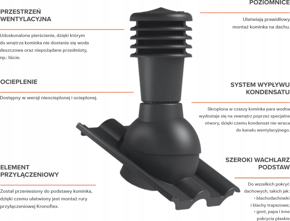 Вентиляційний димохід KRONO-PLAST SMARTLINE для покрівлі з металочерепиці. Використовується для направлення та введення гравітаційних вентиляційних каналів, каналізаційні стояки і вихід труб центрального пилососа над дахом.