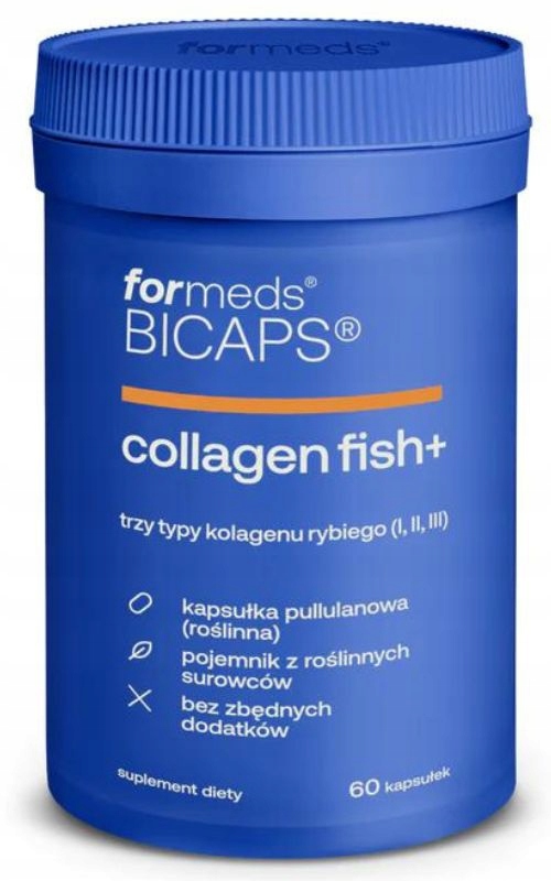 колаген -риба Bicaps+ - дієтична добавка без штучних добавок. Він містить 3 типи рибного колагену: 380 мг типу I, 155 мг типу II та 12 мг типу III у поєднанні з сульфатом хондроїтину, сульфатом глюкозаміну та гіалуроновою кислотою. Композиція